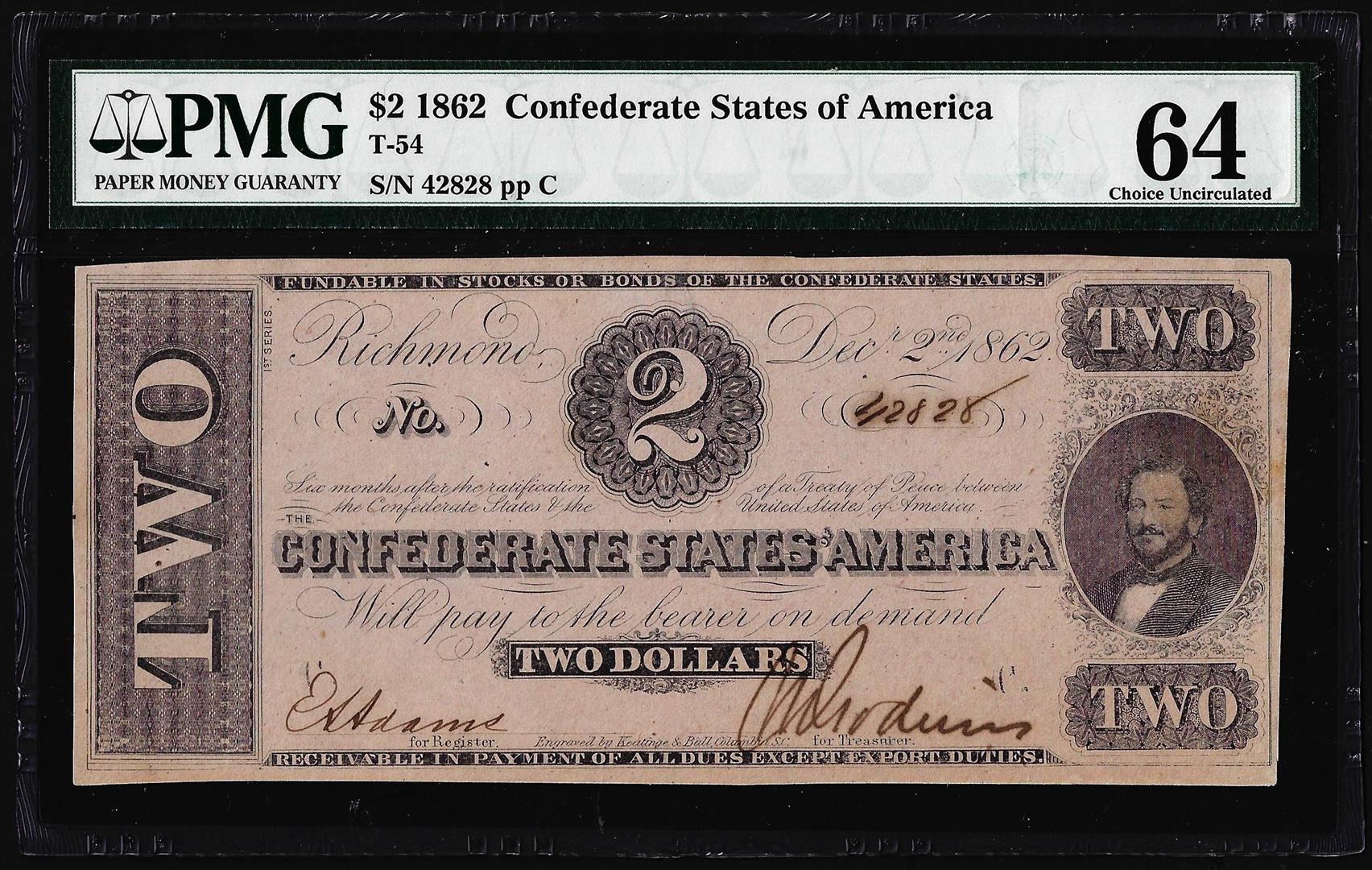 One 1862 $2 Confederate States of Note T-54 PMG Choice Uncirculated 64. PMG Certified.