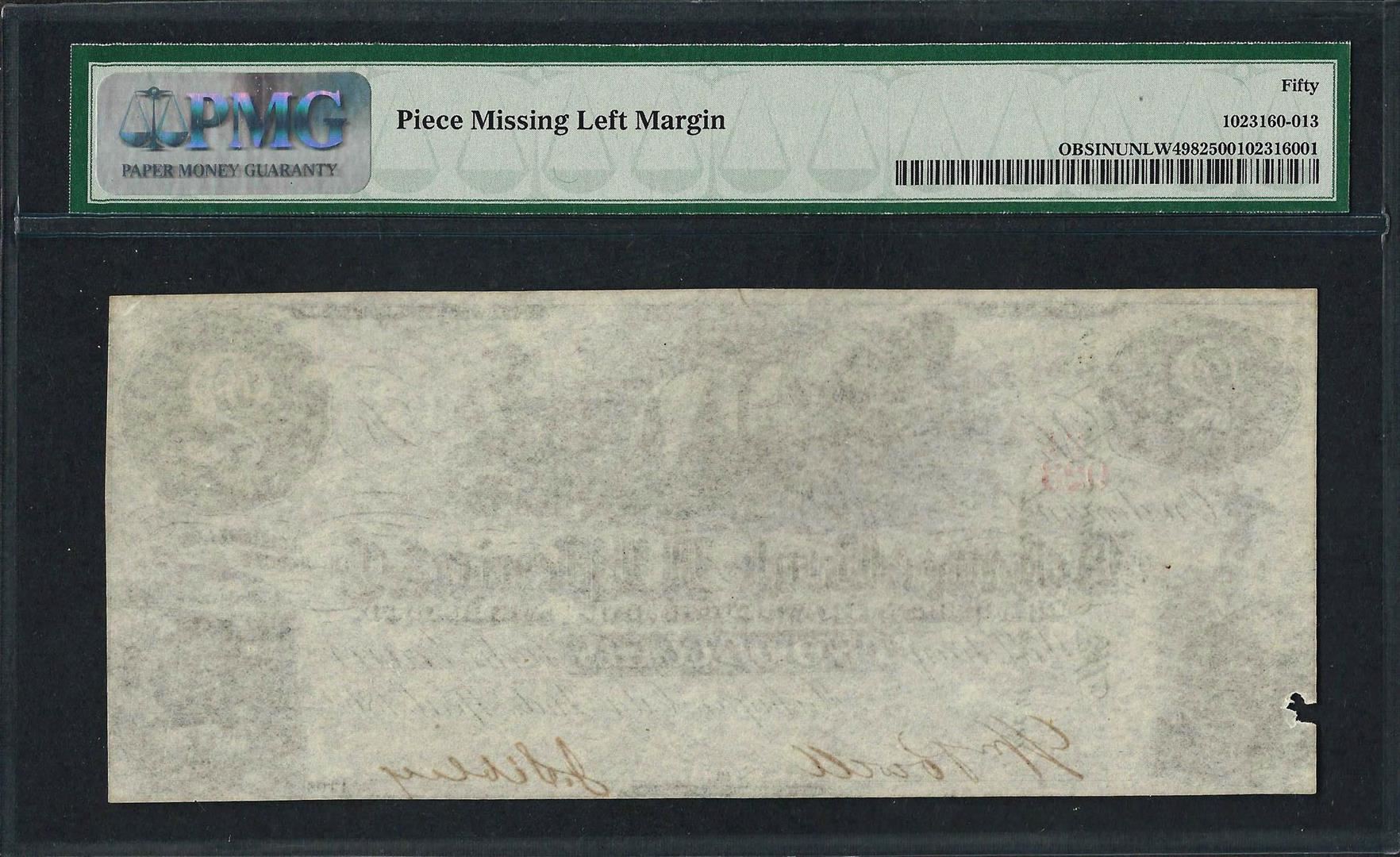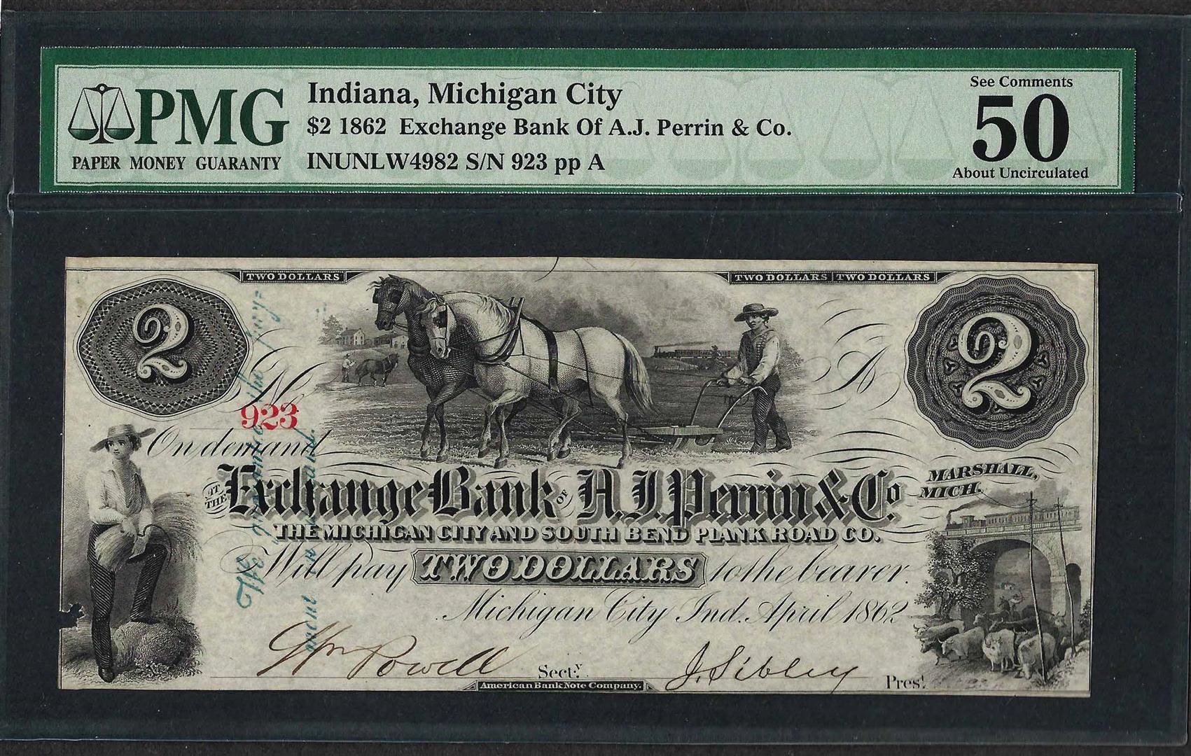 One 1862 $2 Exchange Bank of A.J. Perrin & Co. Obsolete Note PMG About Uncirculated 50. PMG Certified.