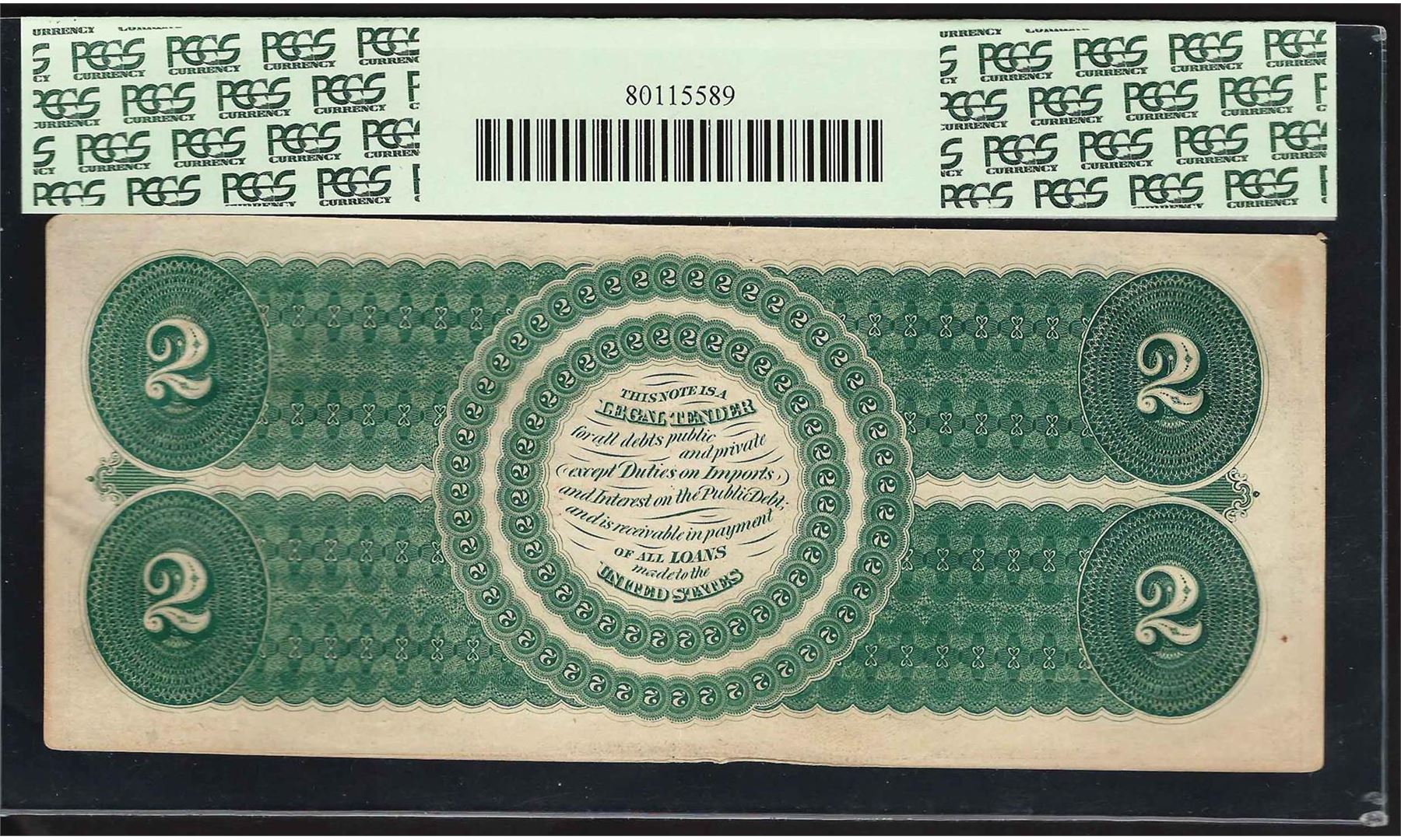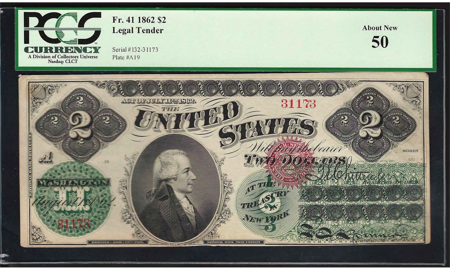 One 1862 $2 Legal Tender Note Fr.41 PCGS About New 50. PCGS Graded.