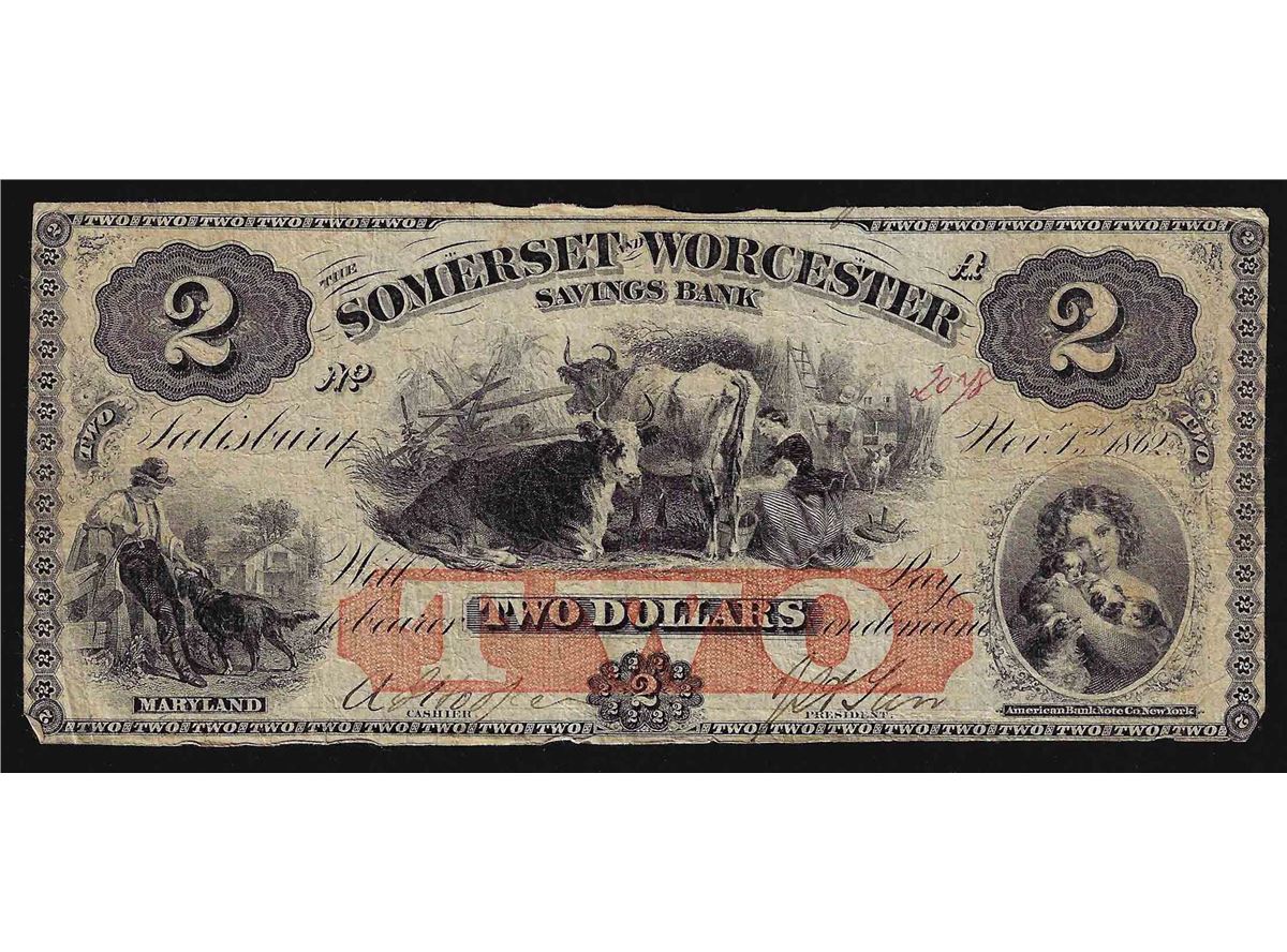 One 1862 $2 Somerset and Worcester Savings Bank Obsolete Bank Note.