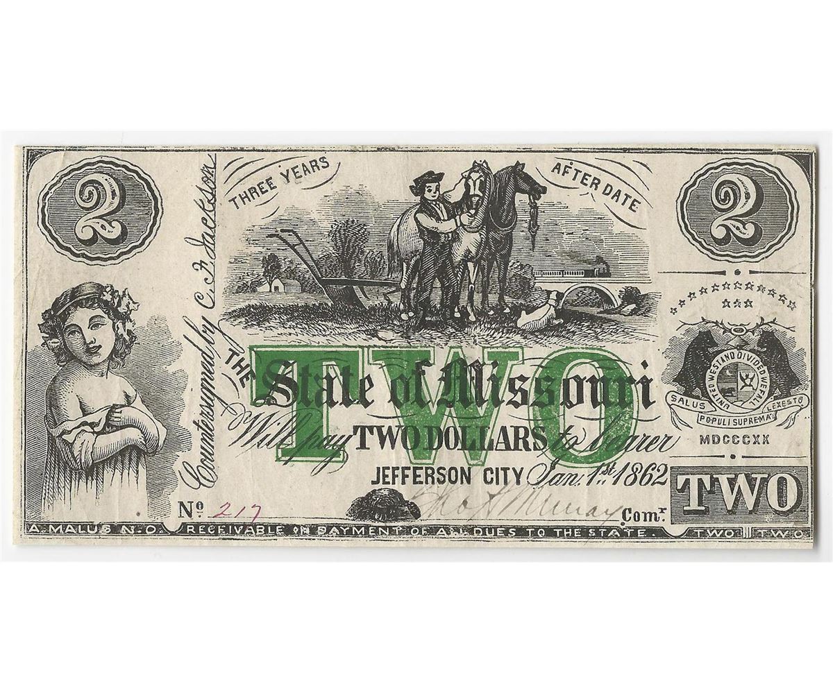 One 1862 $2 State of Missouri Obsolete Bank Note.