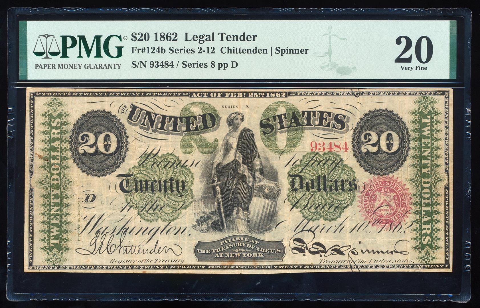 One 1862 $20 Legal Tender Note Fr.124b PMG Very Fine 20. PMG Certified.