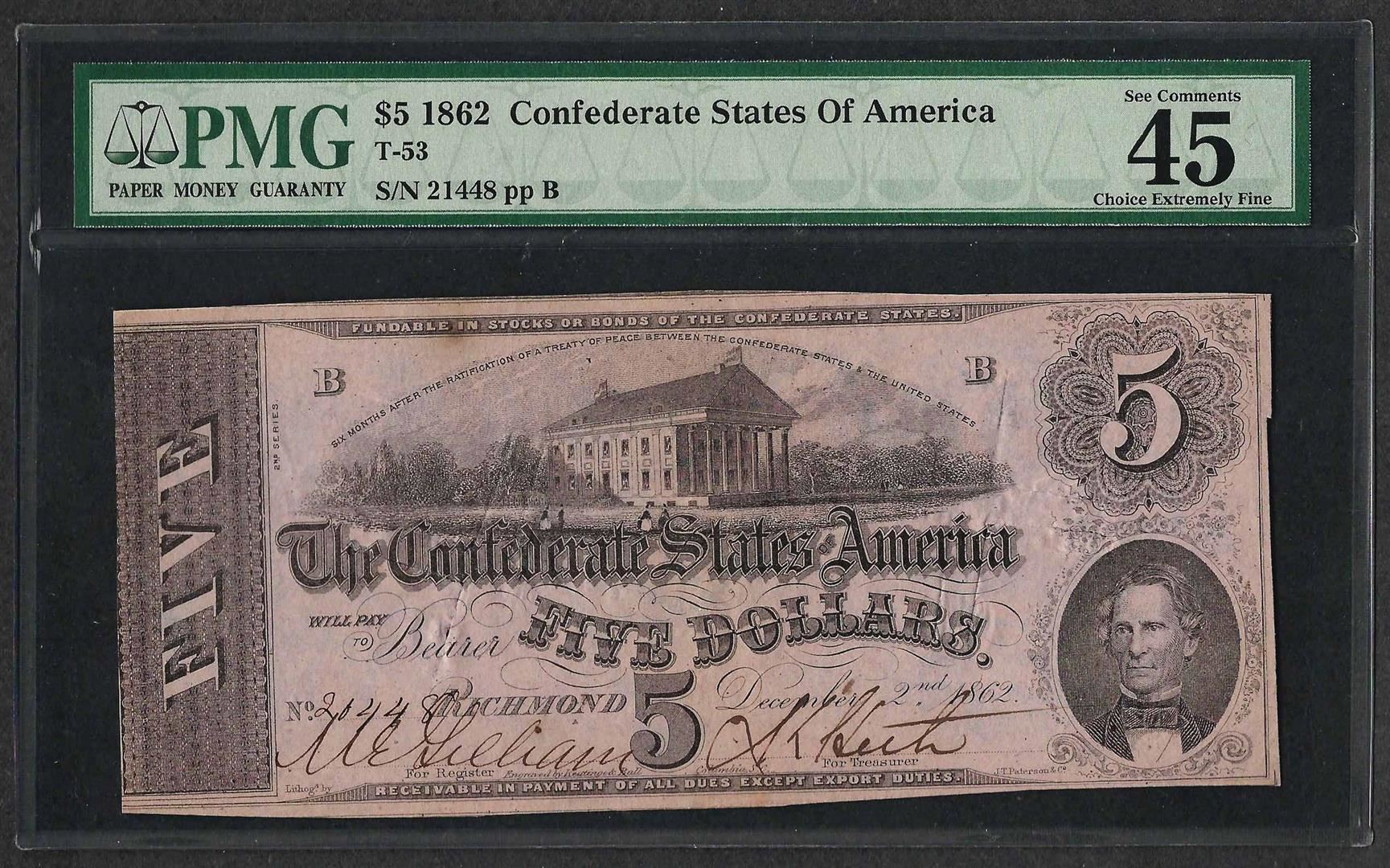 One 1862 $5 Confederate State of America Note T-53 PMG Choice Extremely Fine 45. PMG Certified.
