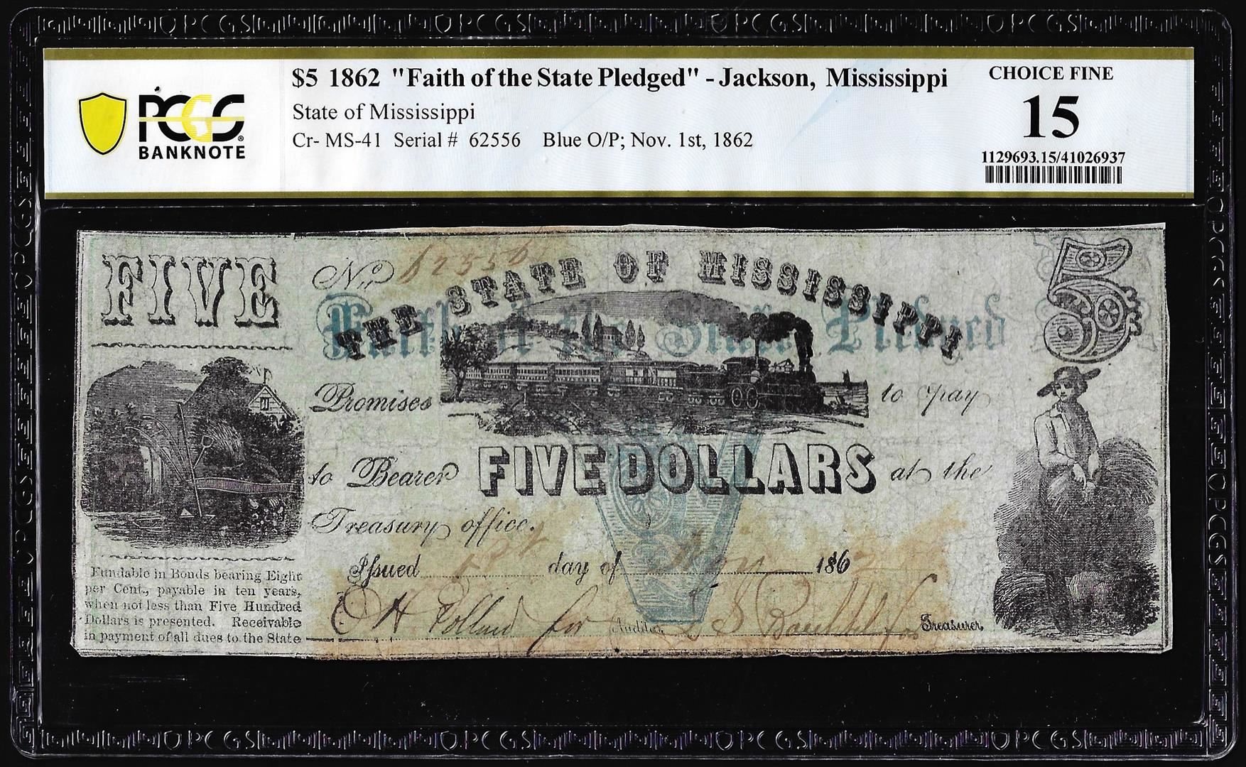 One 1862 $5 Faith of the State Pledged Jackson, MS Obsolete Note PCGS Choice Fine 15. PCGS Graded.