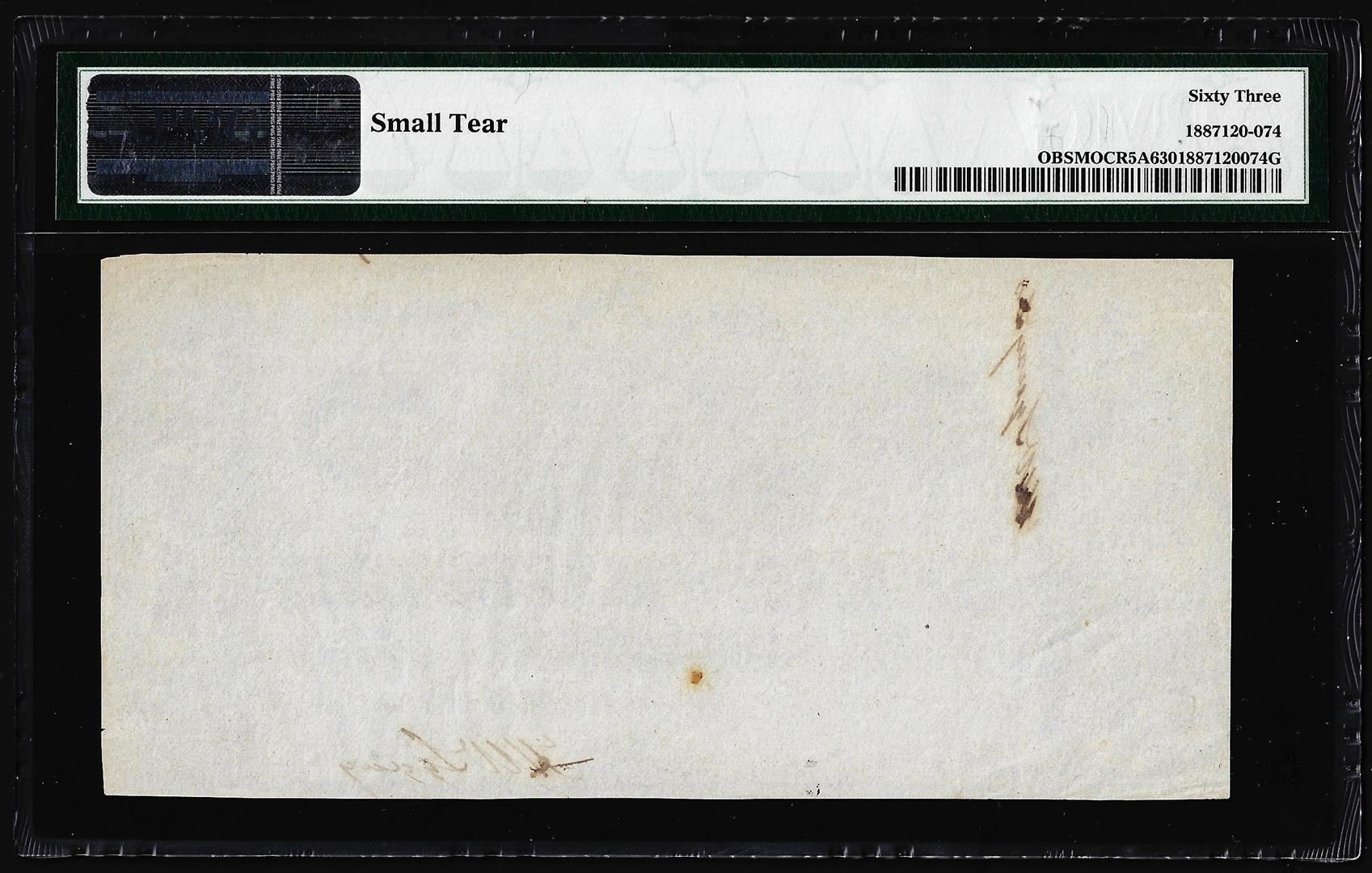 1862 $5 Jefferson, MO State of Missouri Obsolete Note PMG Choice Uncirculated 63