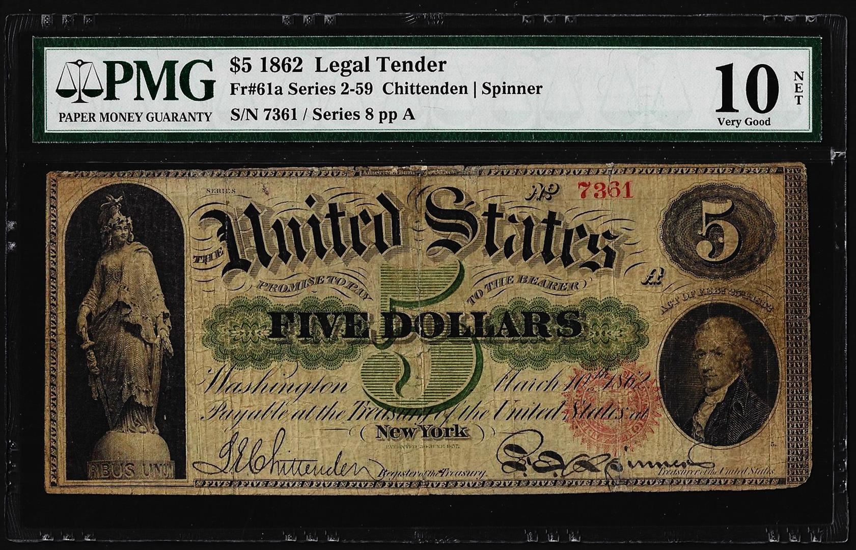 One 1862 $5 Legal Tender Note Fr.61a PMG Very Good 10 Net. PMG Certified.