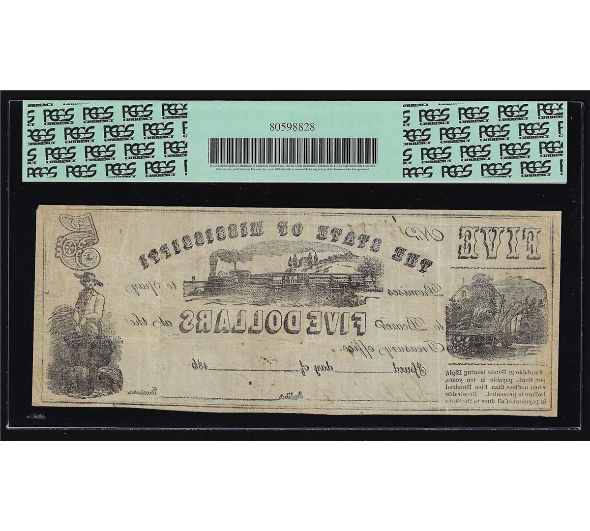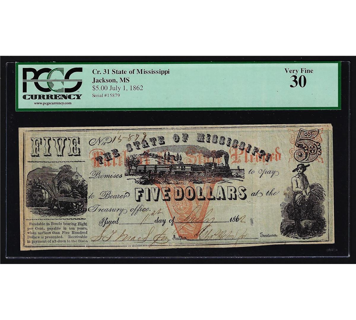 One 1862 $5 State of Mississippi Obsolete Bank Note PCGS VF30. PCGS Graded.
