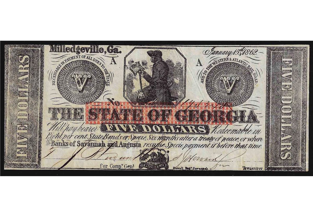 One 1862 $5 The State of Georgia Obsolete Bank Note.