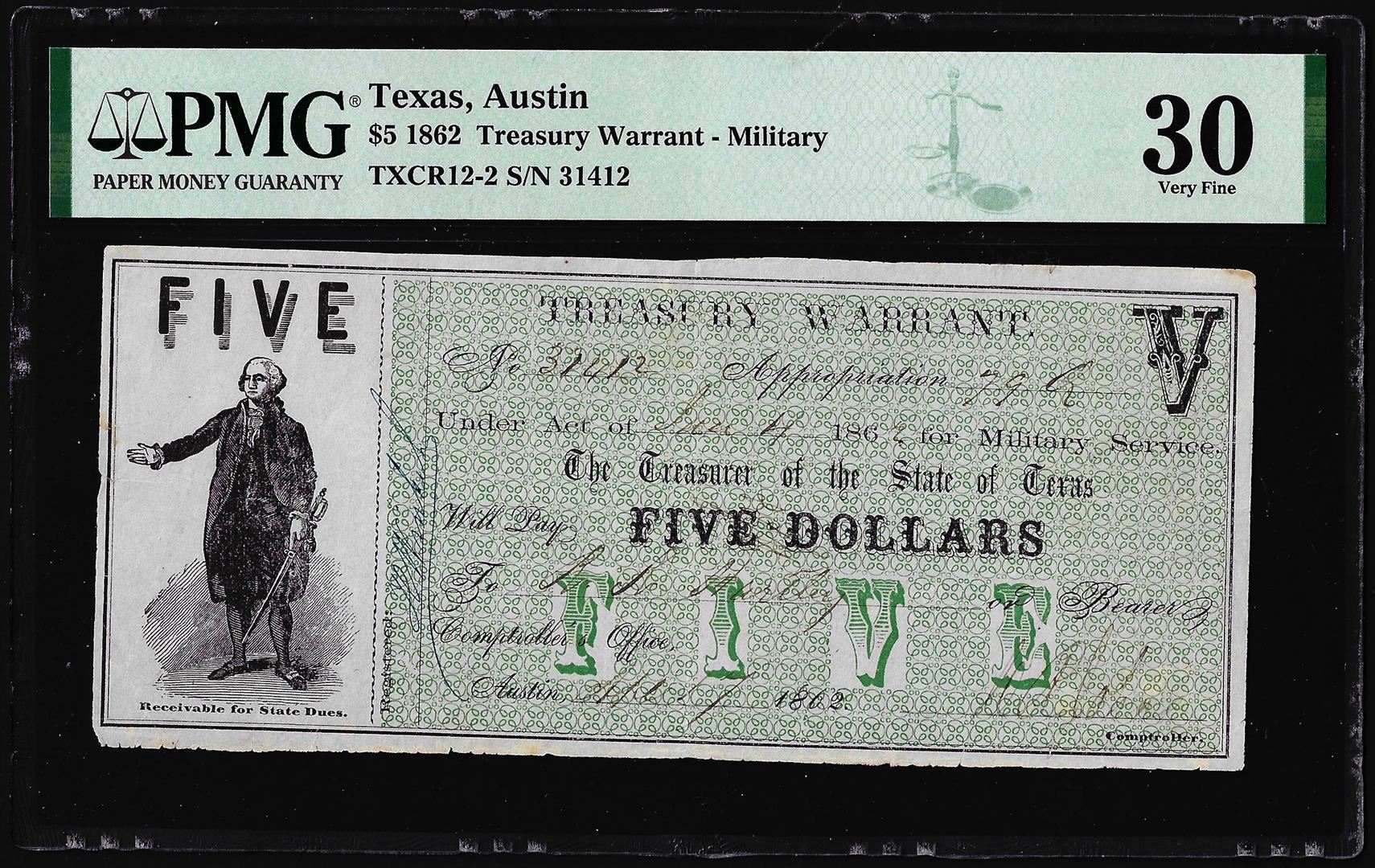 One 1862 $5 Treasury Warrant Austin Texas Military Note PMG Very Fine 30. PMG Certified.