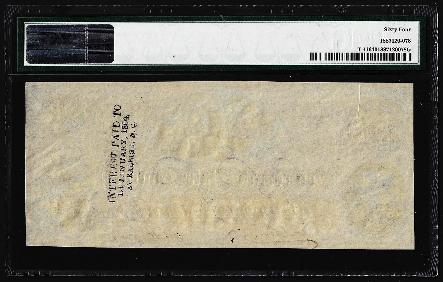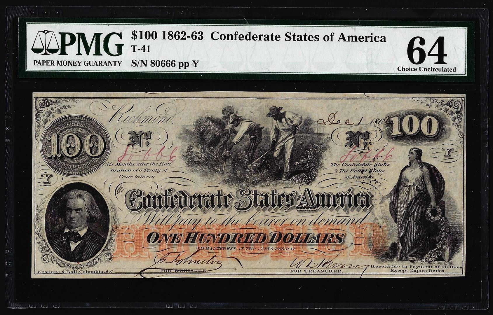 One 1862-63 $100 Confederate States of America Note T-41 PMG Choice Uncirculated 64. PMG Certified.