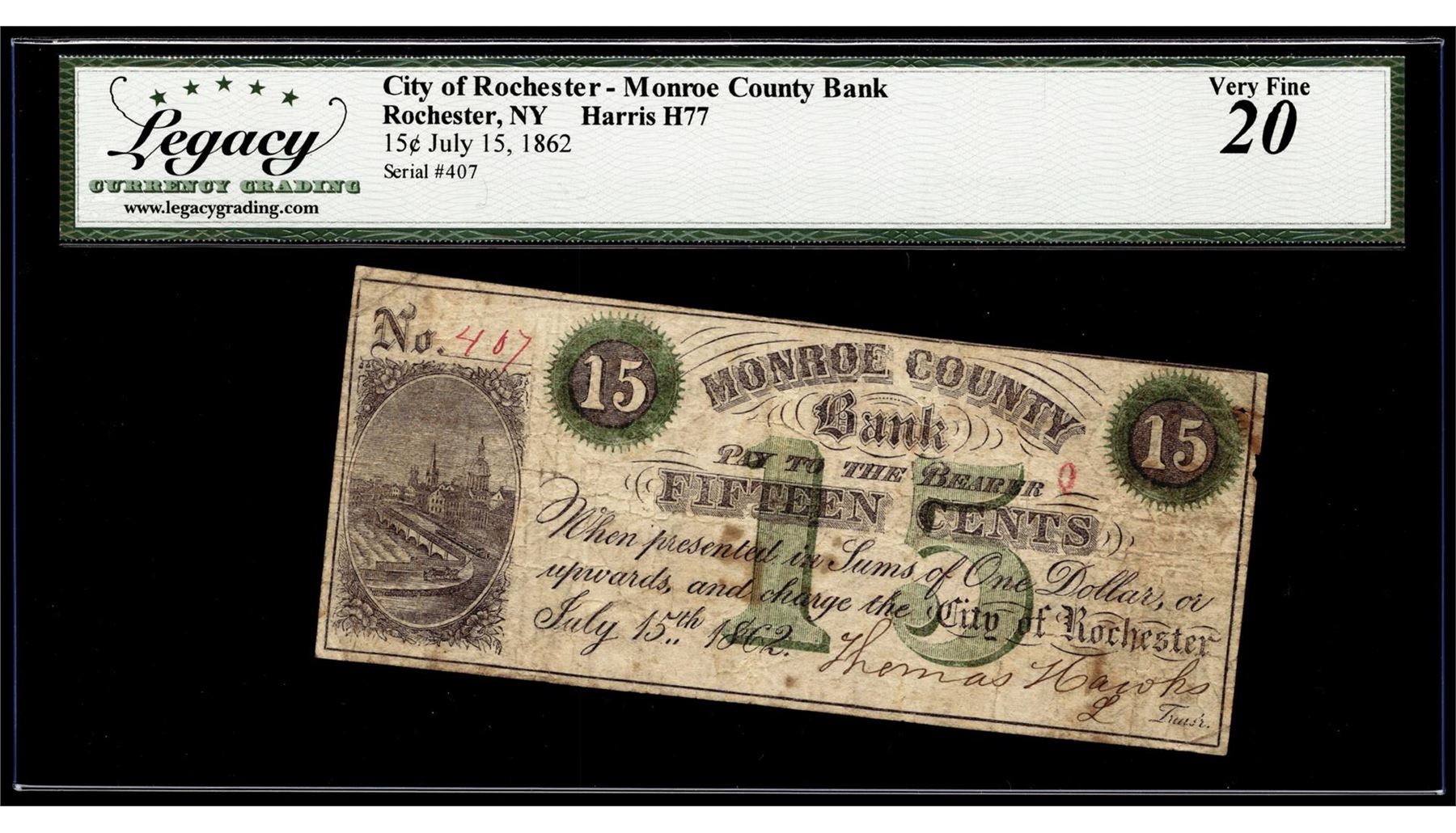 One 1862 Fifteen Cents City of Rochester Monroe County Bank Obsolete Note Legacy VF20. Legacy Graded.
