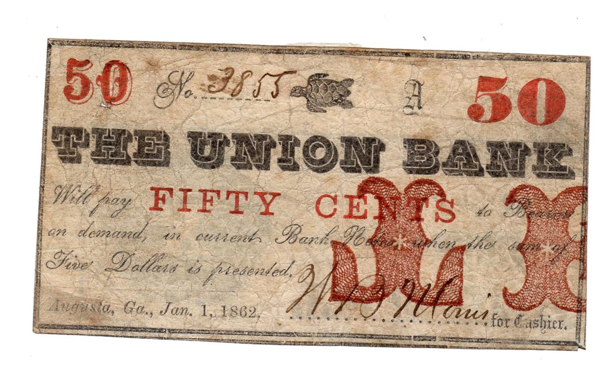1862 Fifty Cent Union Bank Note Printed on the Back of $10 Note