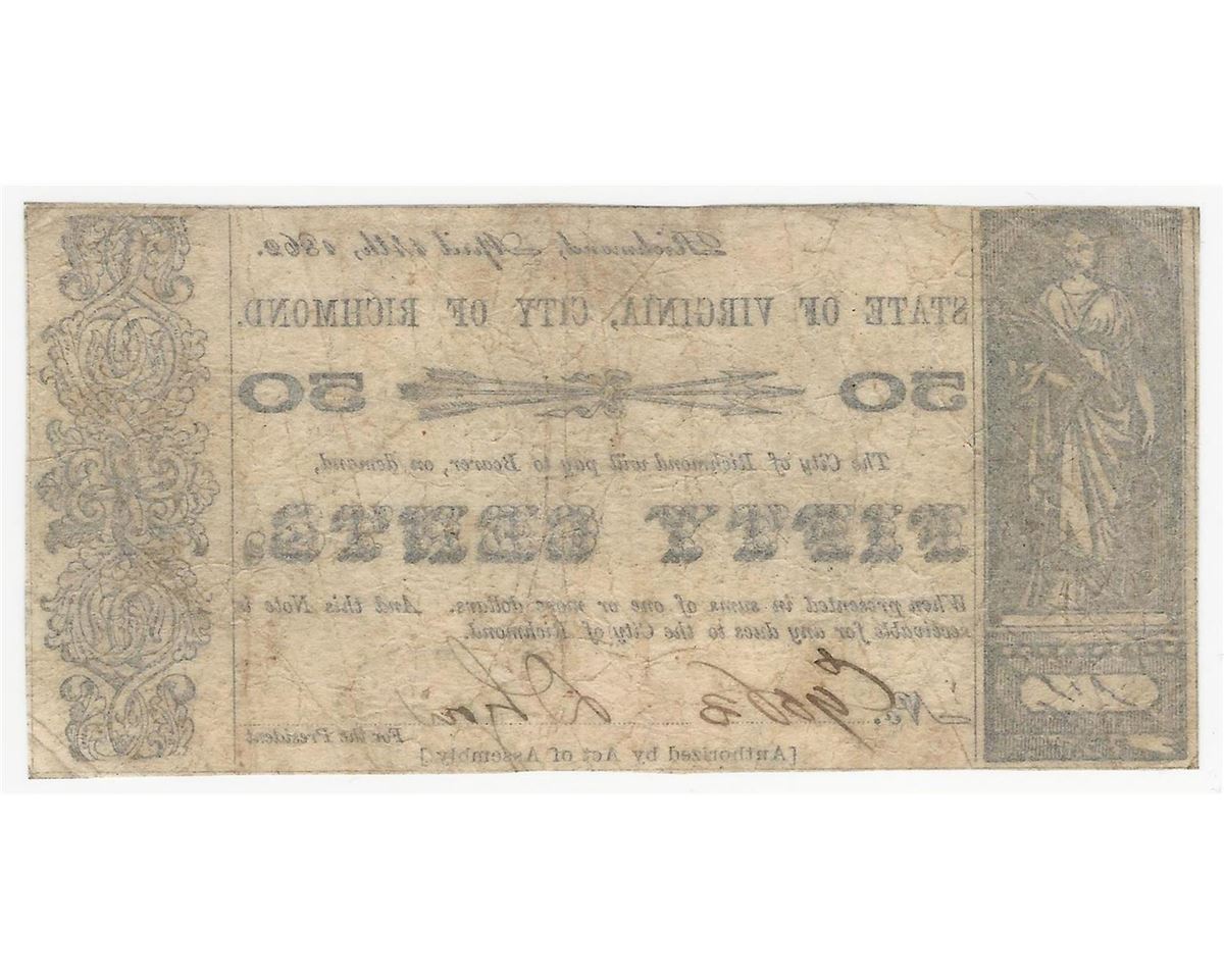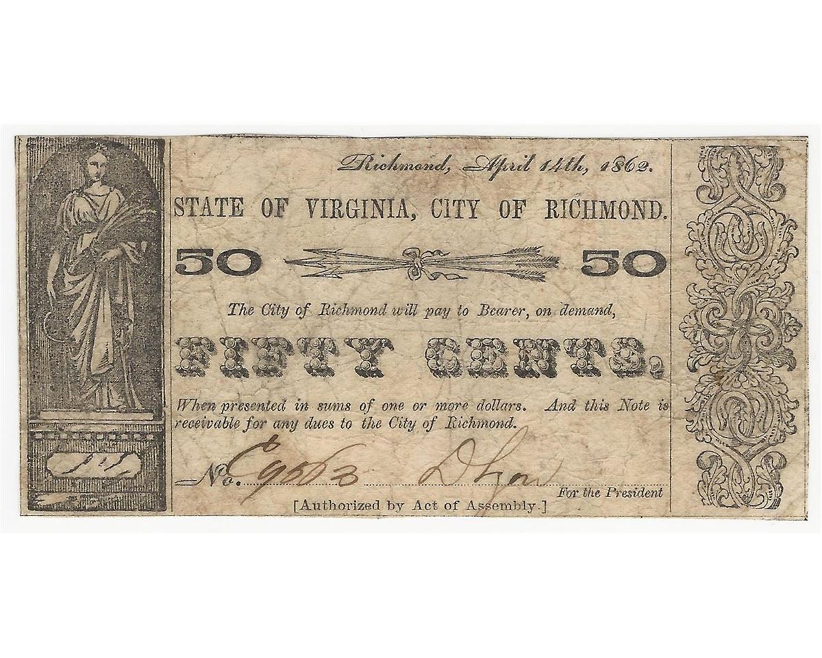One 1862 Fifty Cents State of Virginia, City of Richmond Obsolete Note.