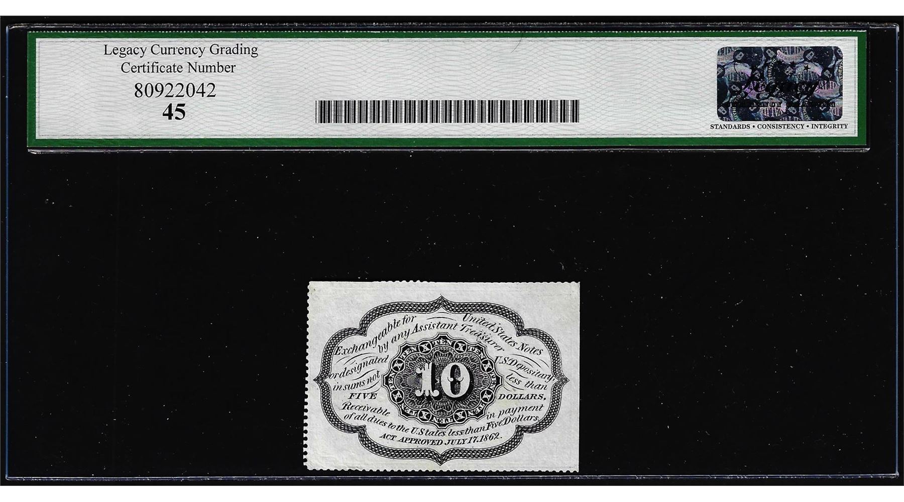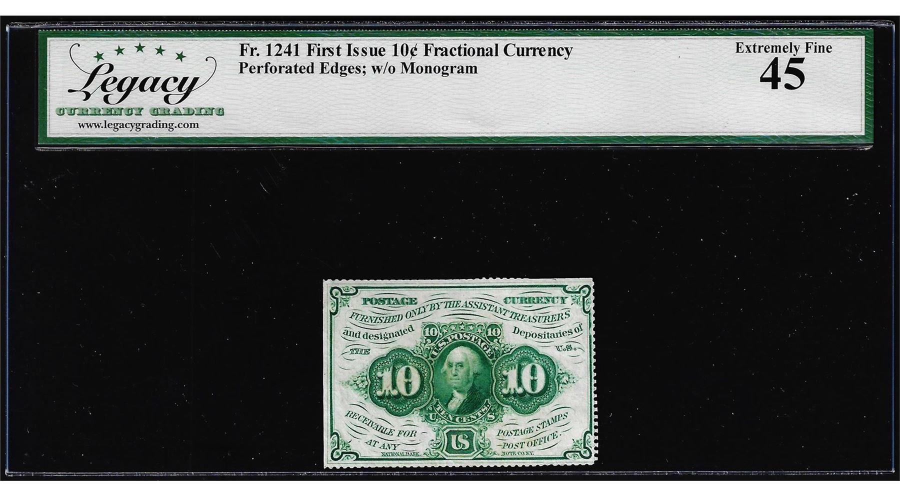 One 1862 First Issue 10 Cent Fractional Currency Note Fr.1241 Legacy Extremely Fine 45. Legacy Graded.