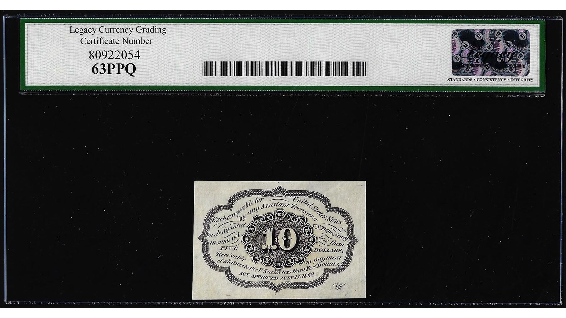One 1862 First Issue 10 Cent Fractional Currency Note Fr.1242 Legacy Choice New 63PPQ. Legacy Graded.