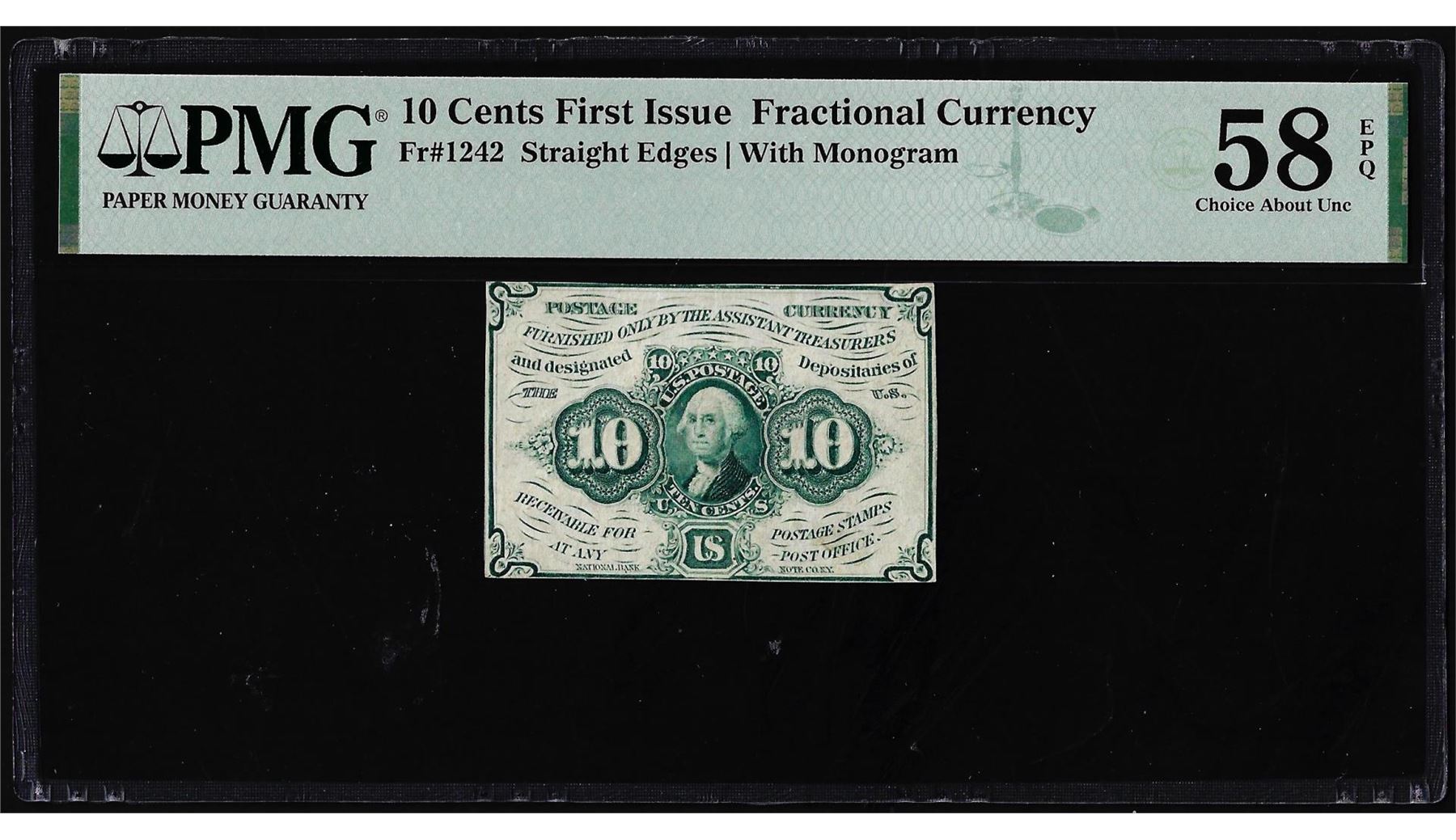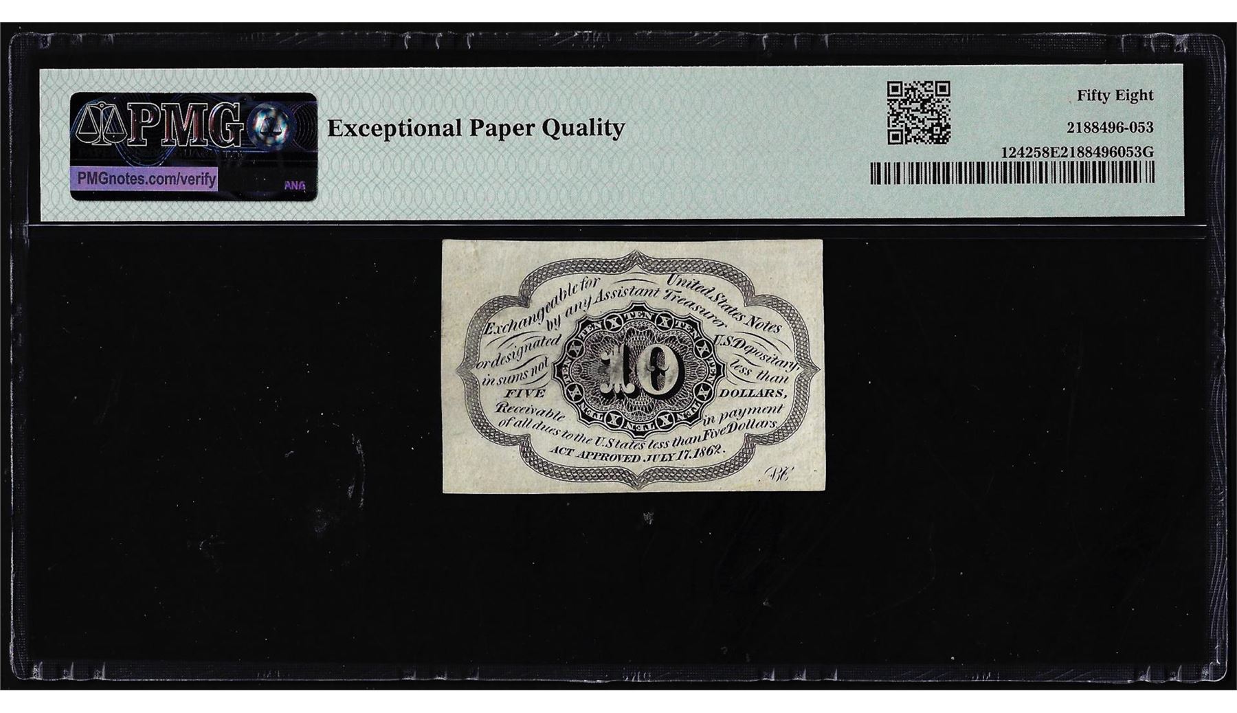 One 1862 First Issue 10 Cent Fractional Currency Note Fr.1242 PMG Choice About Unc 58EPQ. PMG Certified.