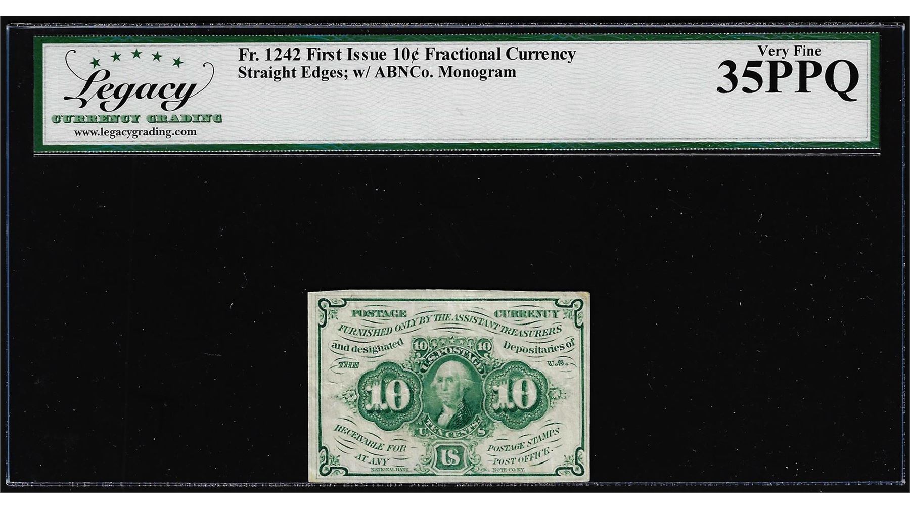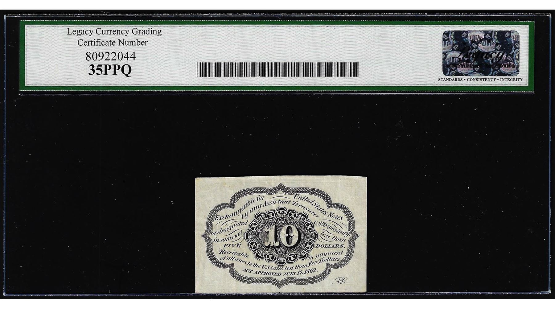 One 1862 First Issue 10 Cent Fractional Currency Note Fr.1242 Very Fine 35PPQ. Legacy Graded.