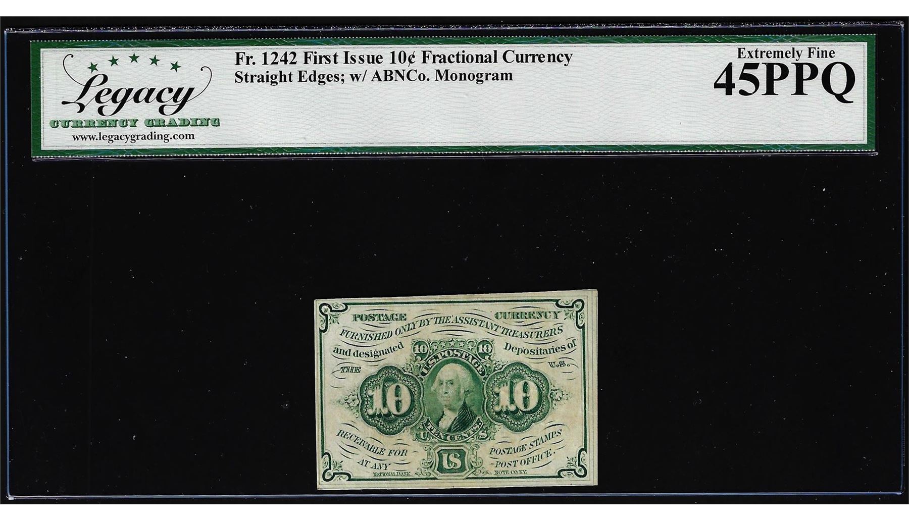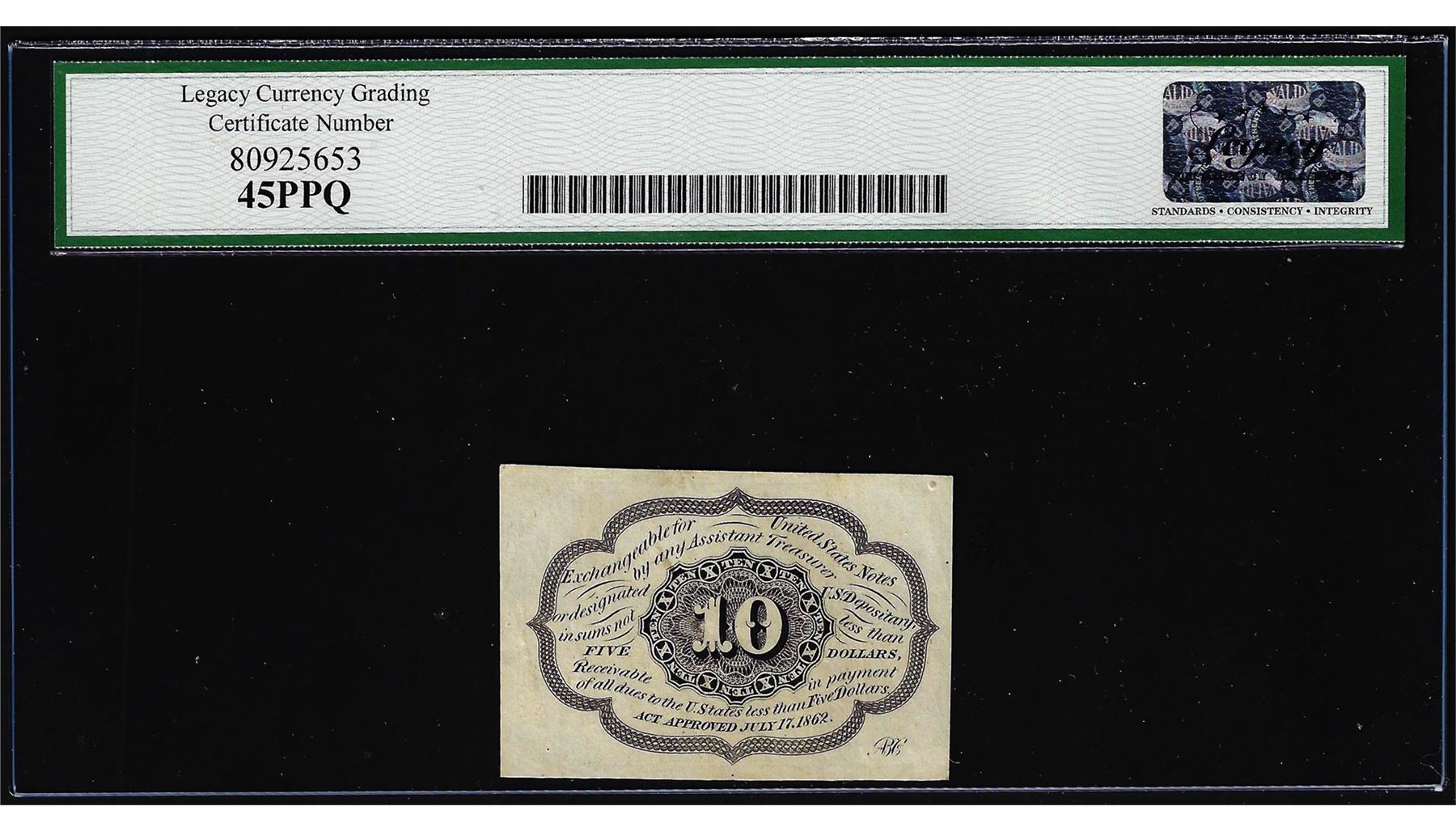 One 1862 First Issue 10 Cent Fractional Note Fr.1242 Legacy Extremely Fine 45PPQ. Legacy Graded.