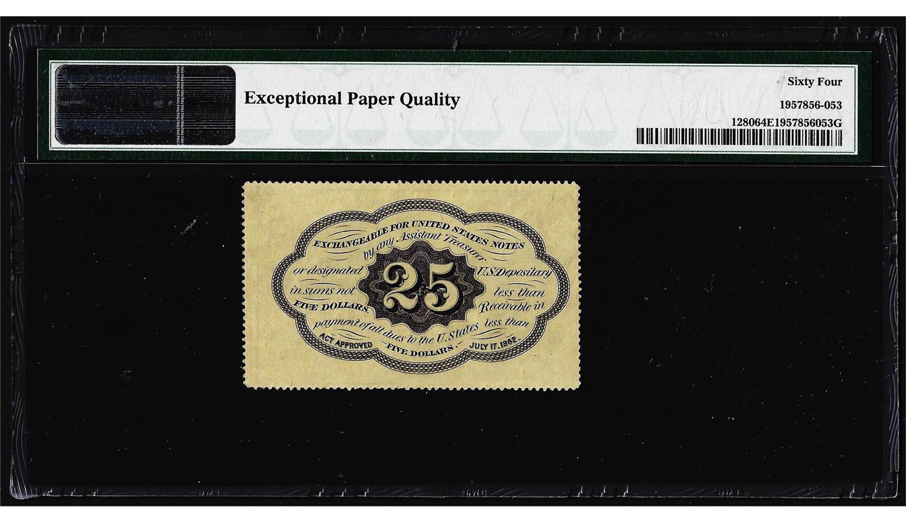 One 1862 First Issue 25 Cent Fractional Currency Note Fr.1280 PMG Choice Uncirculated 64EPQ. PMG Certified.