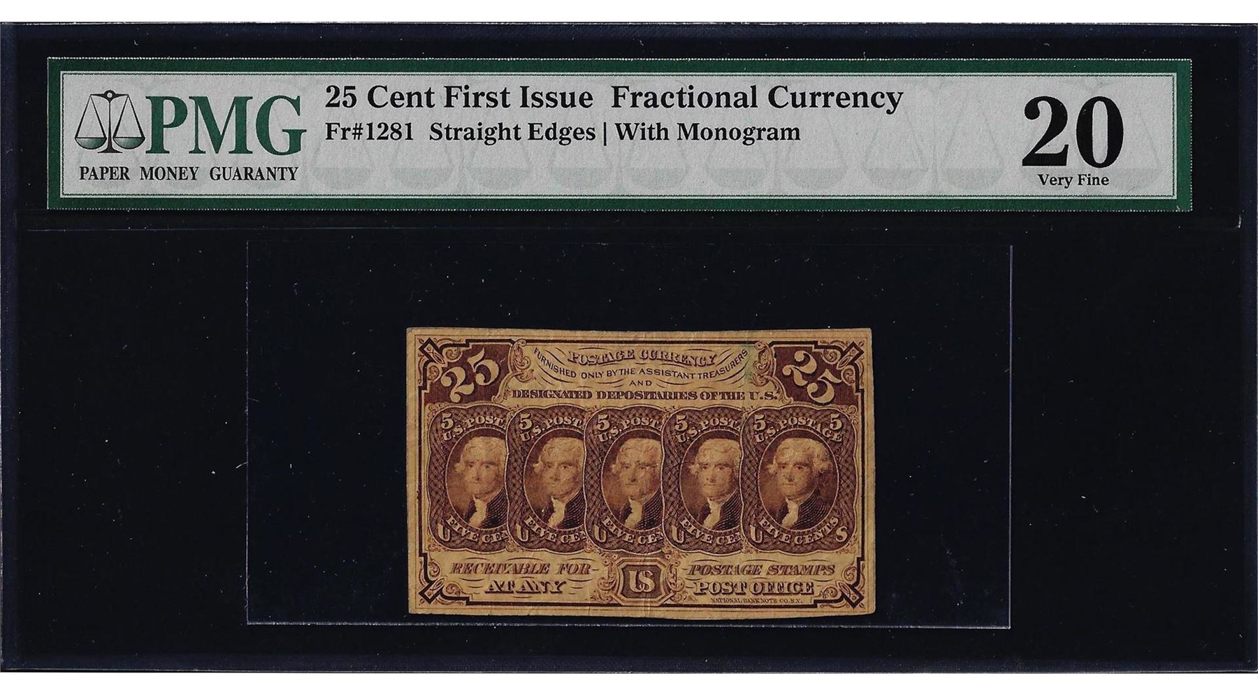One 1862 First Issue 25 Cent Fractional Currency Note PMG Very Fine 20. PMG Certified.