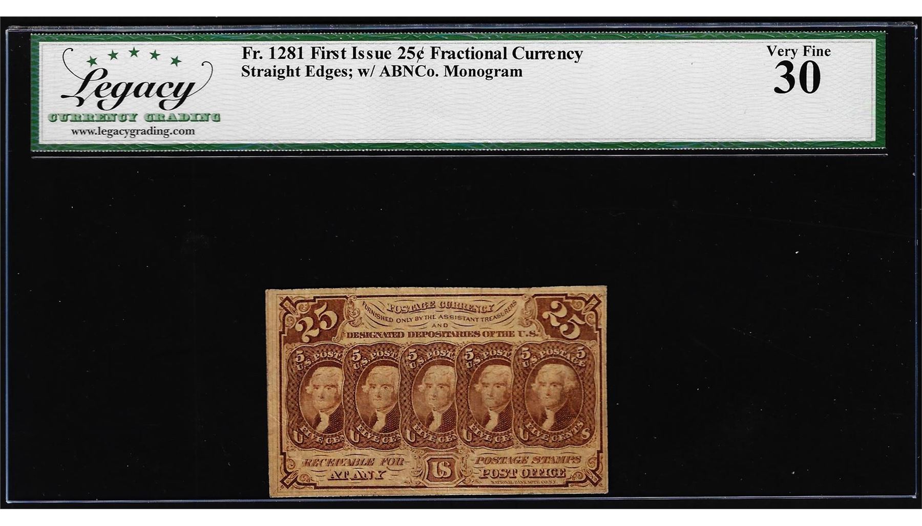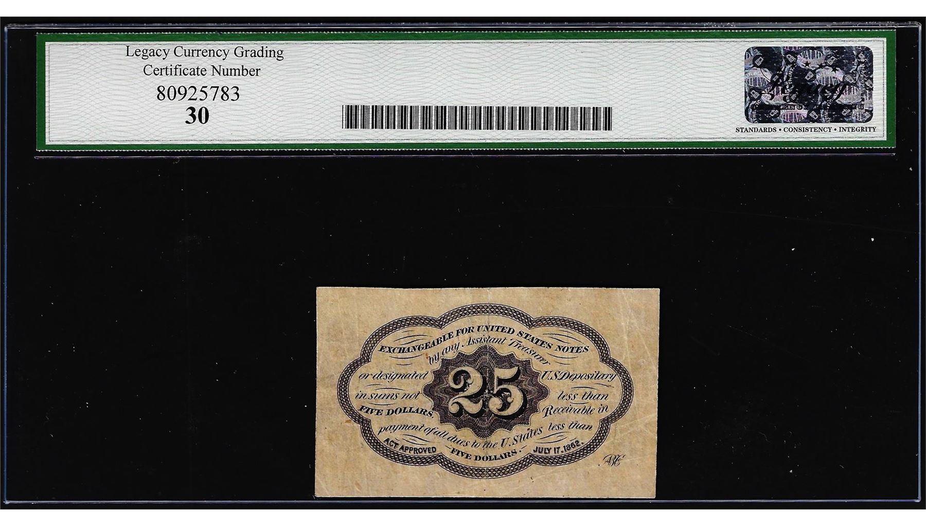 One 1862 First Issue 25 Cents Fractional Currency Note Fr.1281 Legacy Very Fine 30. Legacy Graded.