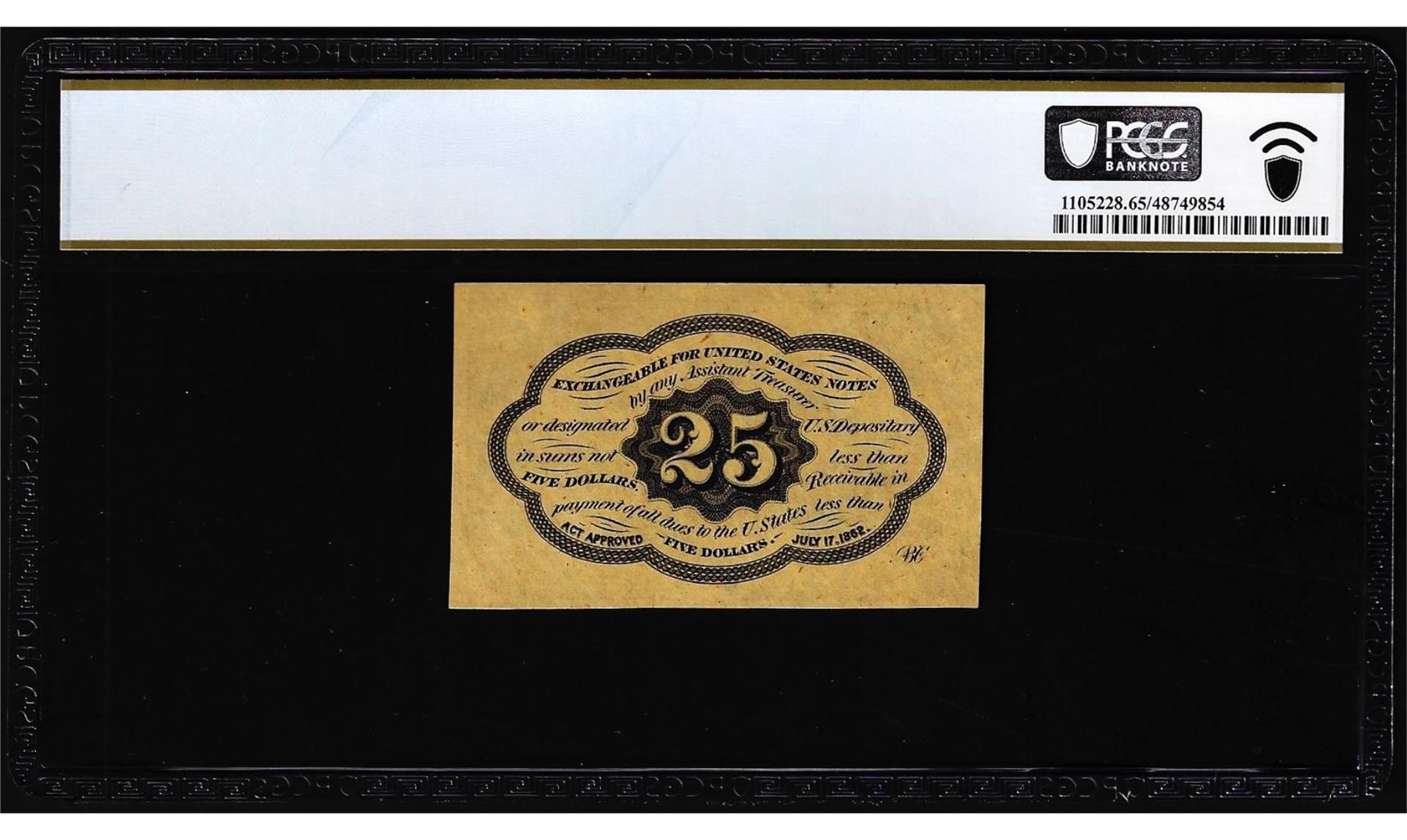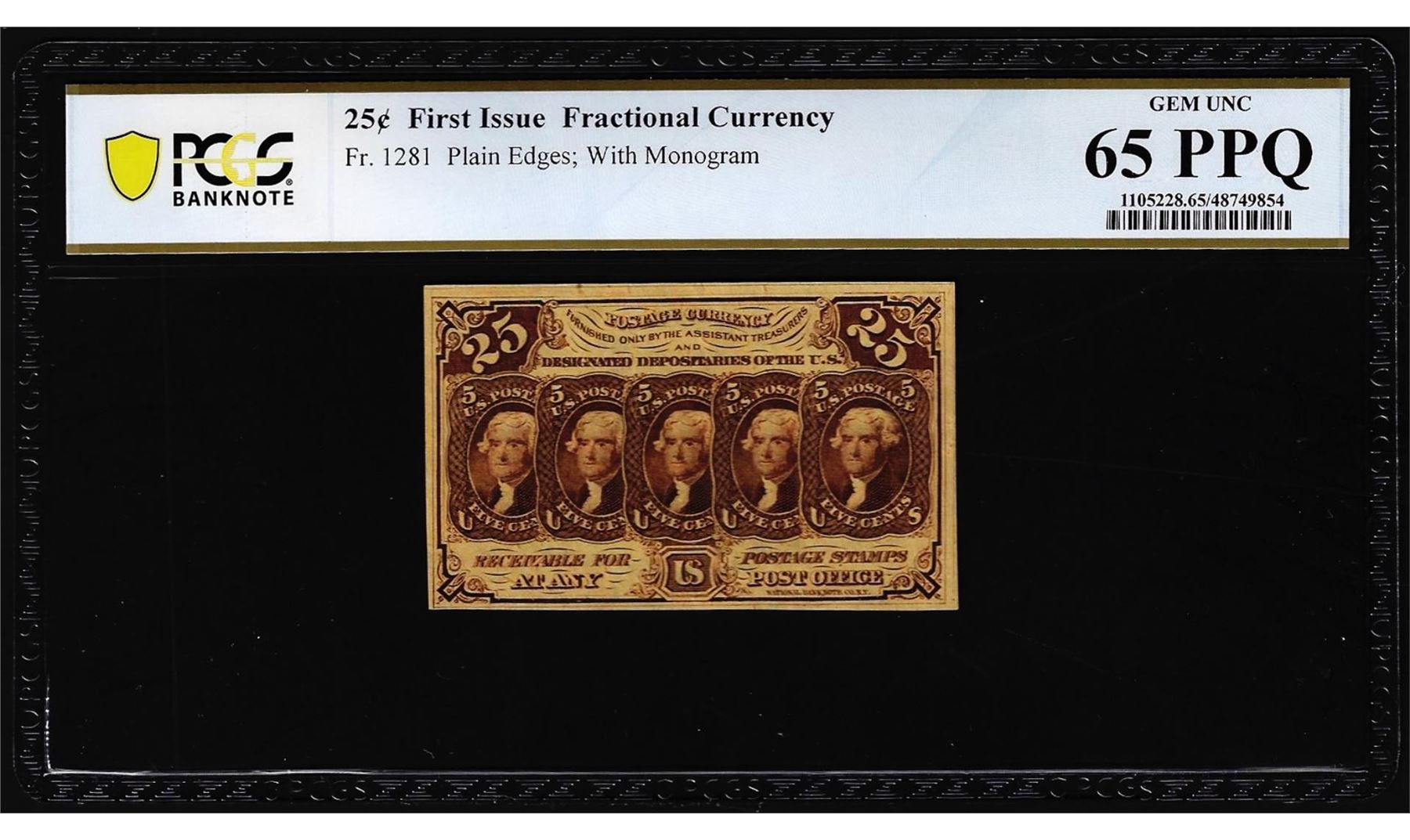 One 1862 First Issue 25 Cents Fractional Currency Note Fr.1281 PCGS Gem Unc 65PPQ. PCGS Graded.