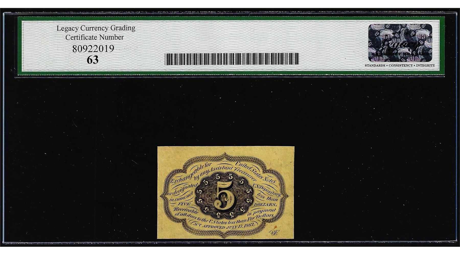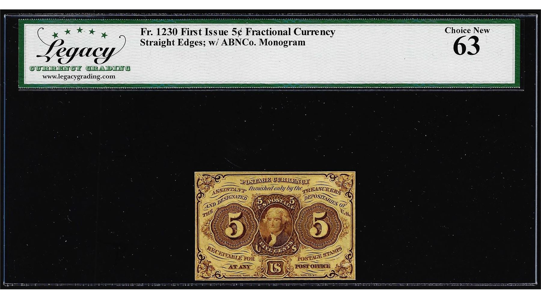 One 1862 First Issue 5 Cent Fractional Currency Note Fr.1230 Legacy Choice New 63. Legacy Graded.