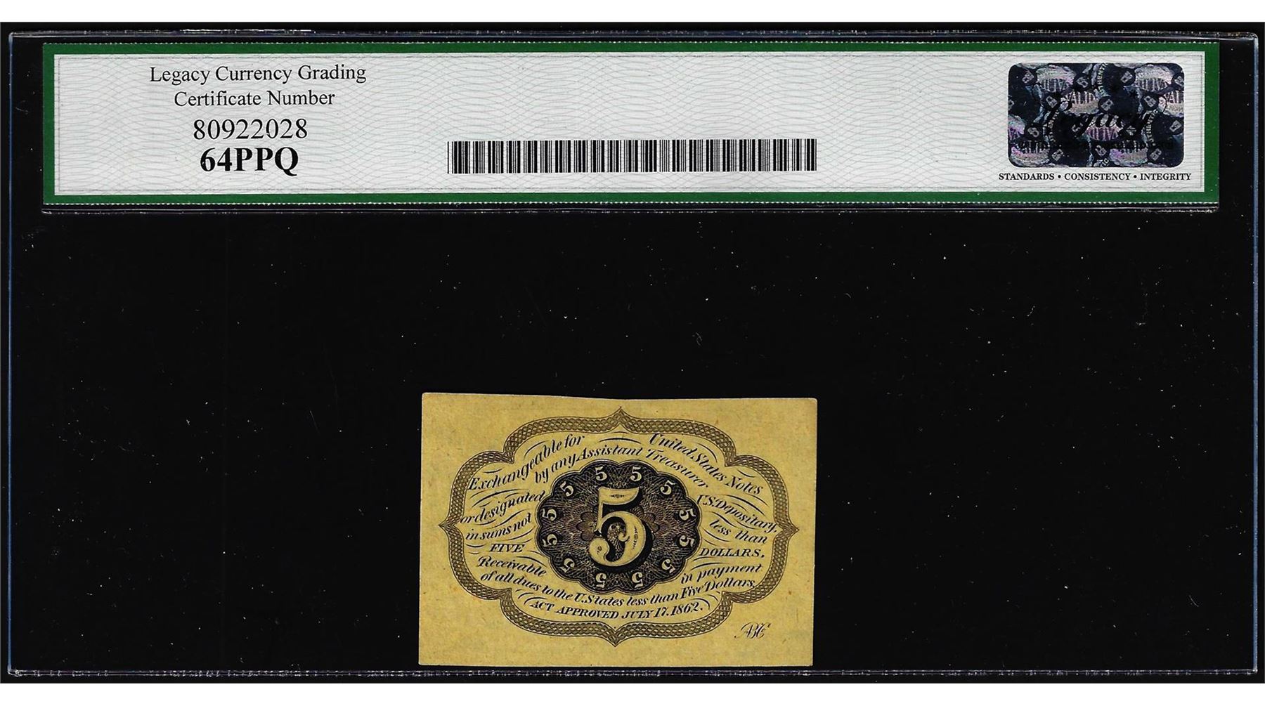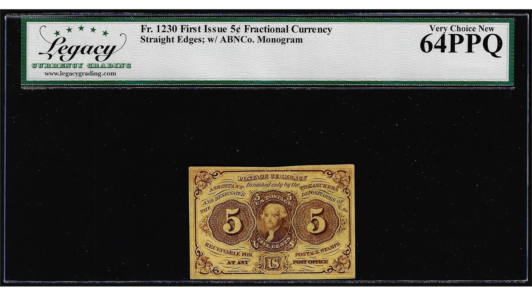 One 1862 First Issue 5 Cent Fractional Currency Note Fr.1230 Legacy Very Choice New 64PPQ. Legacy Graded.