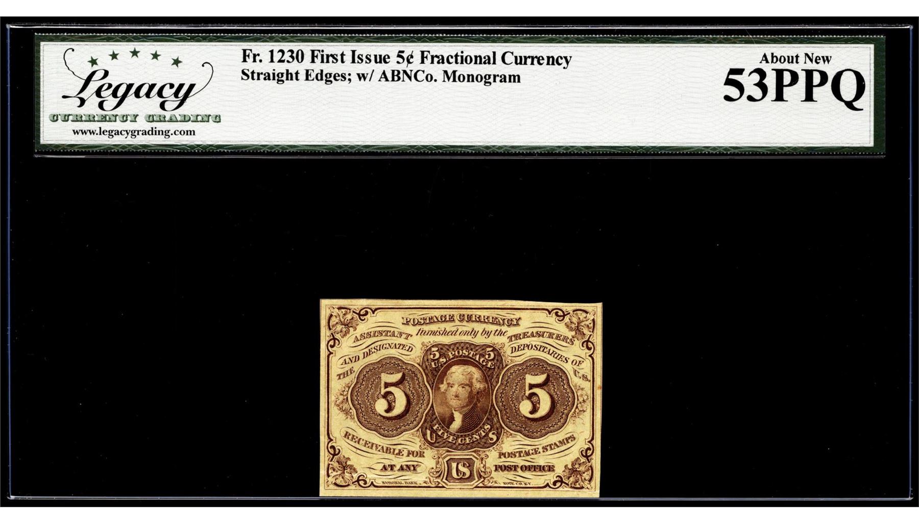 One 1862 First Issue 5 Cents Fractional Currency Note Fr.1230 Legacy About New 53PPQ. Legacy Graded.