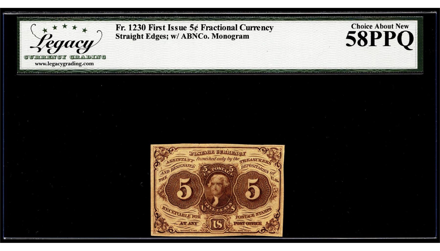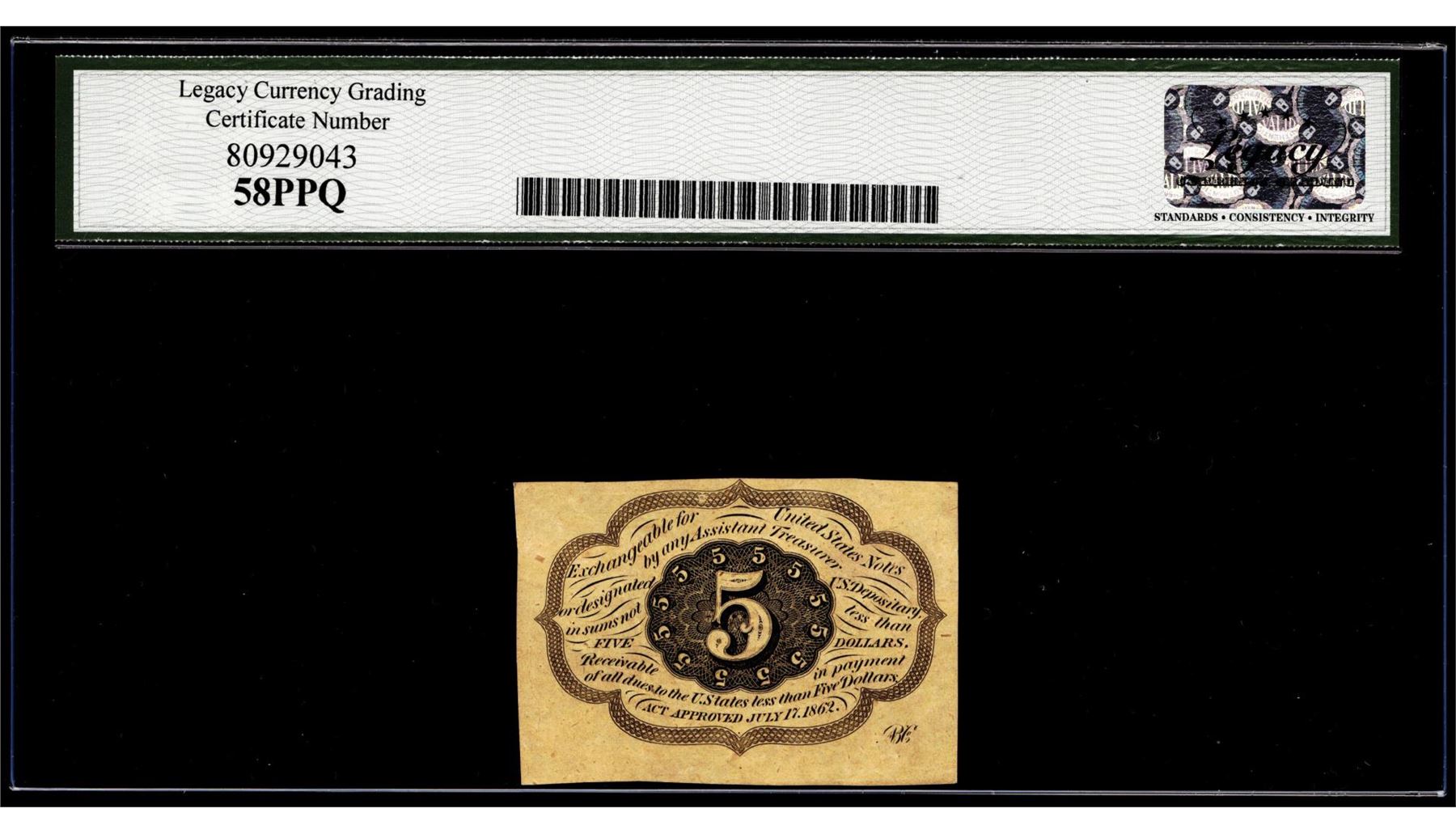 One 1862 First Issue 5 Cents Fractional Currency Note Fr.1230 Legacy Ch. About New 58PPQ. Legacy Graded.