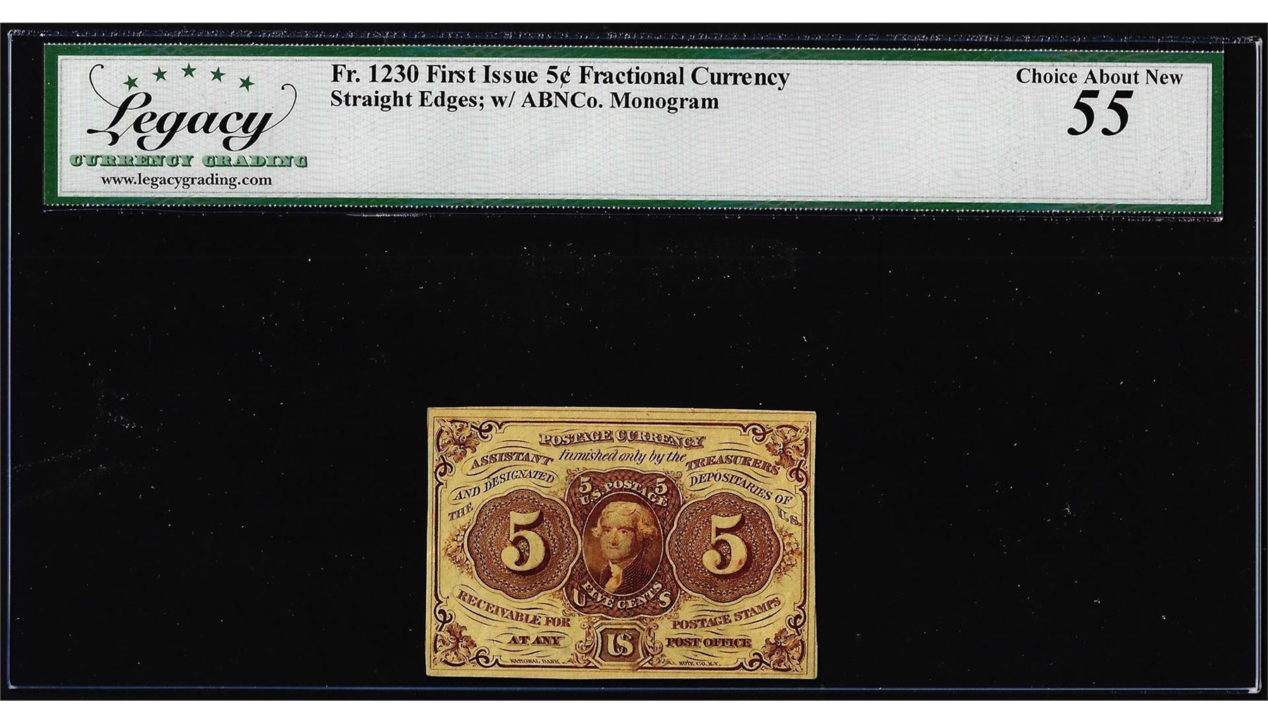 One 1862 First Issue 5 Cents Fractional Currency Note Fr.1230 Legacy Choice About New 55. Legacy Graded.