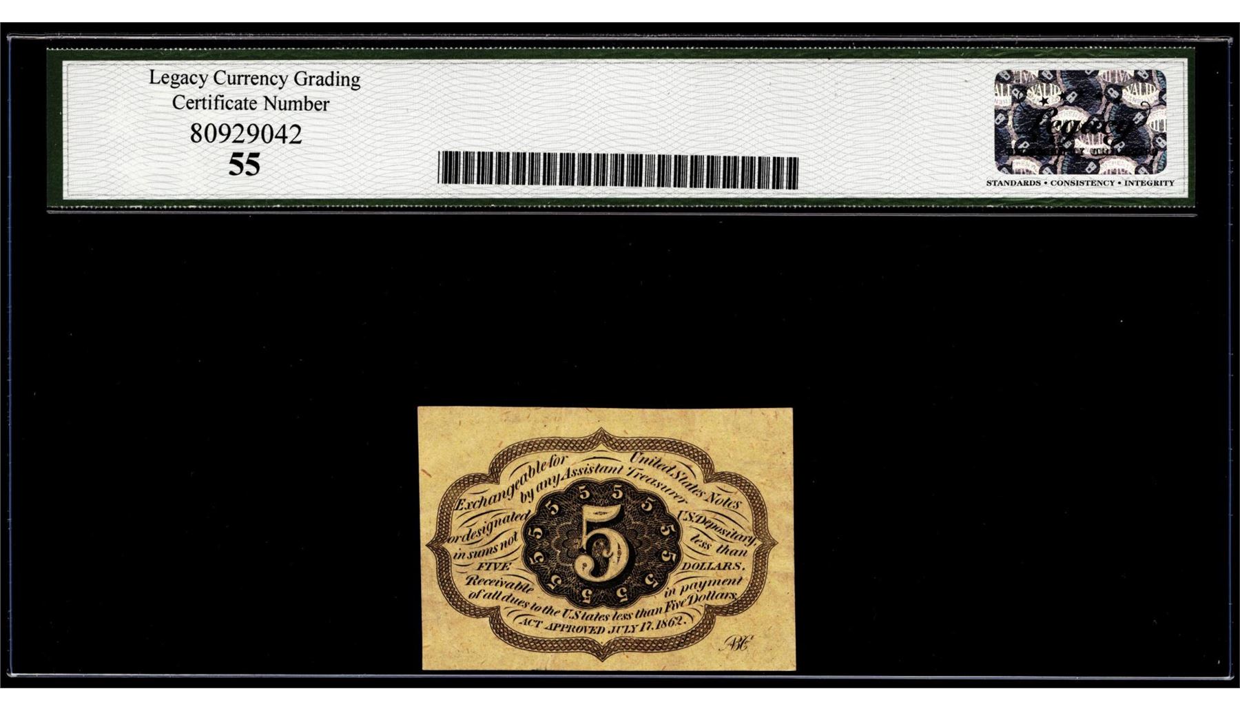 One 1862 First Issue 5 Cents Fractional Currency Note Fr.1230 Legacy Choice About New 55. Legacy Graded.
