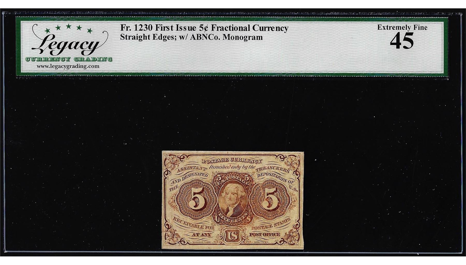 One 1862 First Issue 5 Cents Fractional Currency Note Fr.1230 Legacy Extremely Fine 45. Legacy Graded.