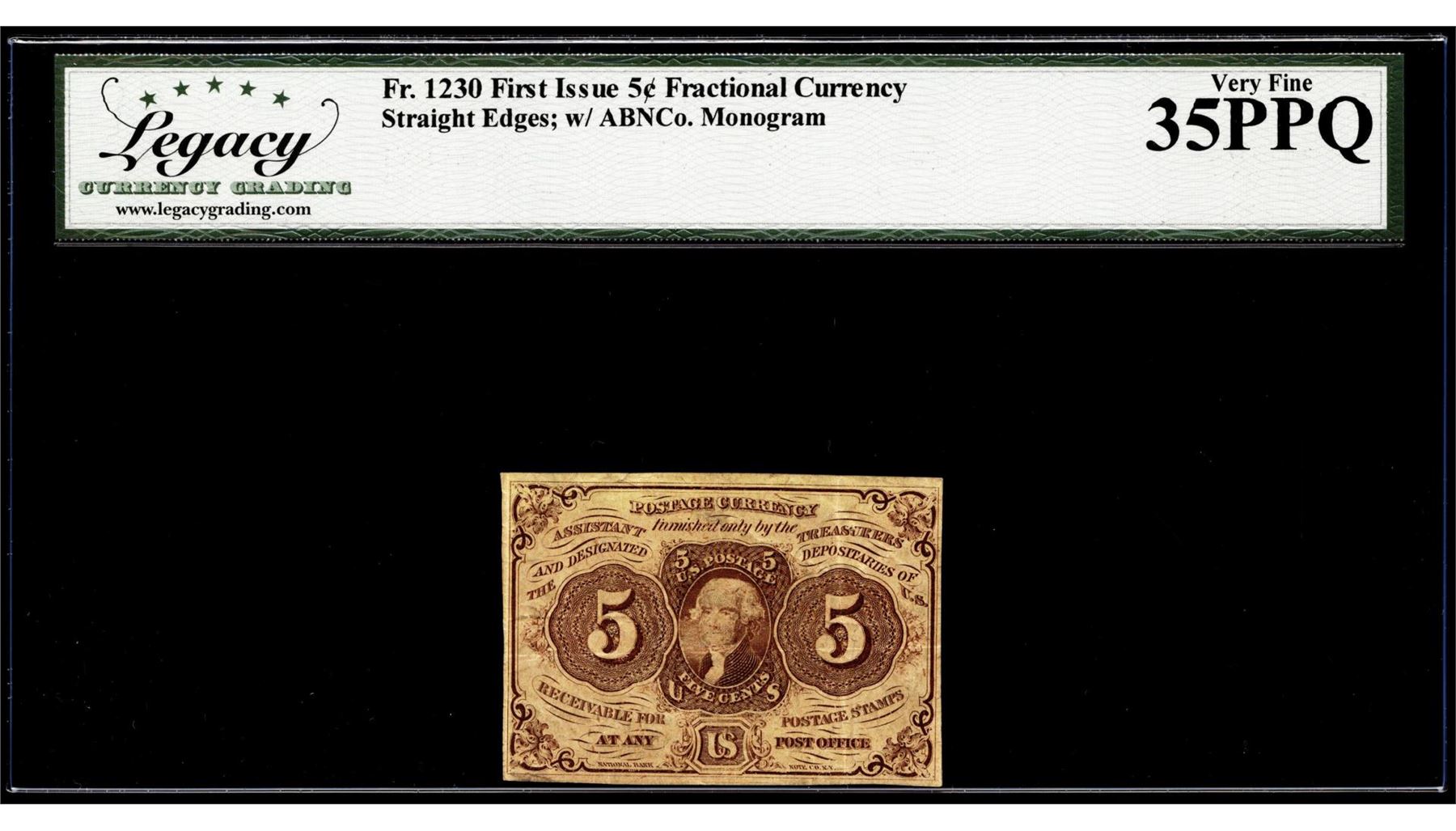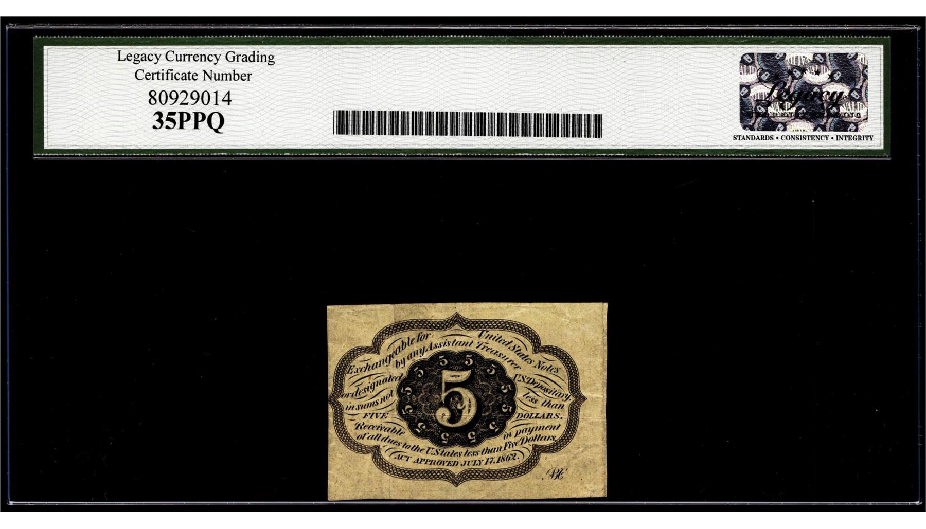 One 1862 First Issue 5 Cents Fractional Currency Note Fr.1230 Legacy Very Fine 35PPQ. Legacy Graded.