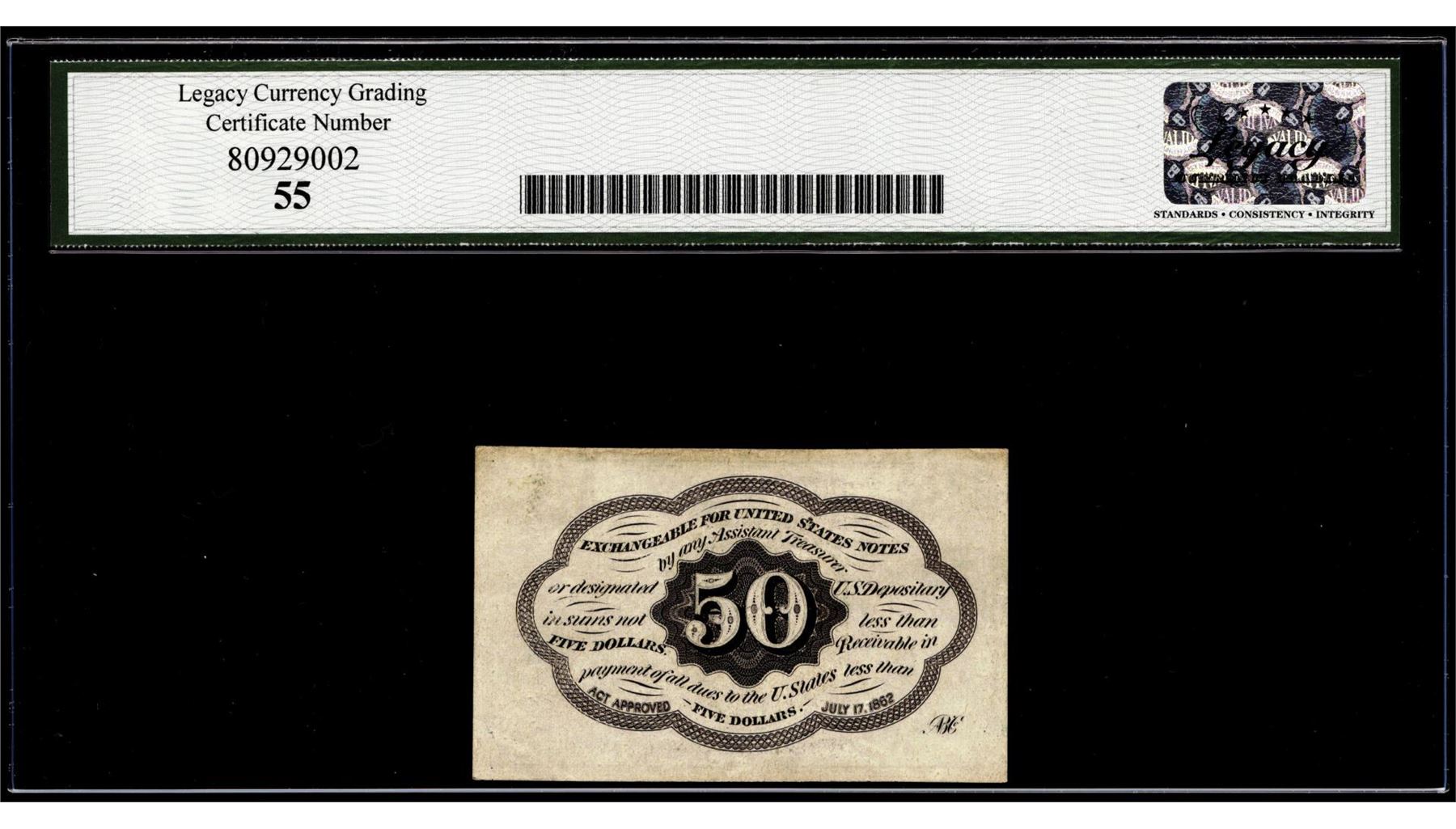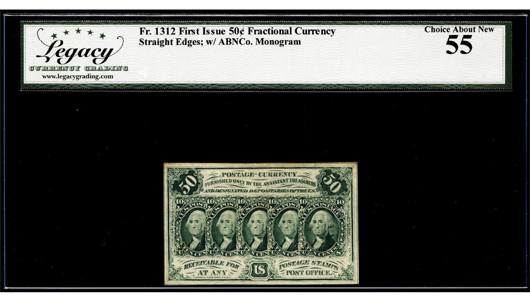 One 1862 First Issue 50 Cents Fractional Currency Note Fr.1312 Legacy Choice About New 55. Legacy Graded.