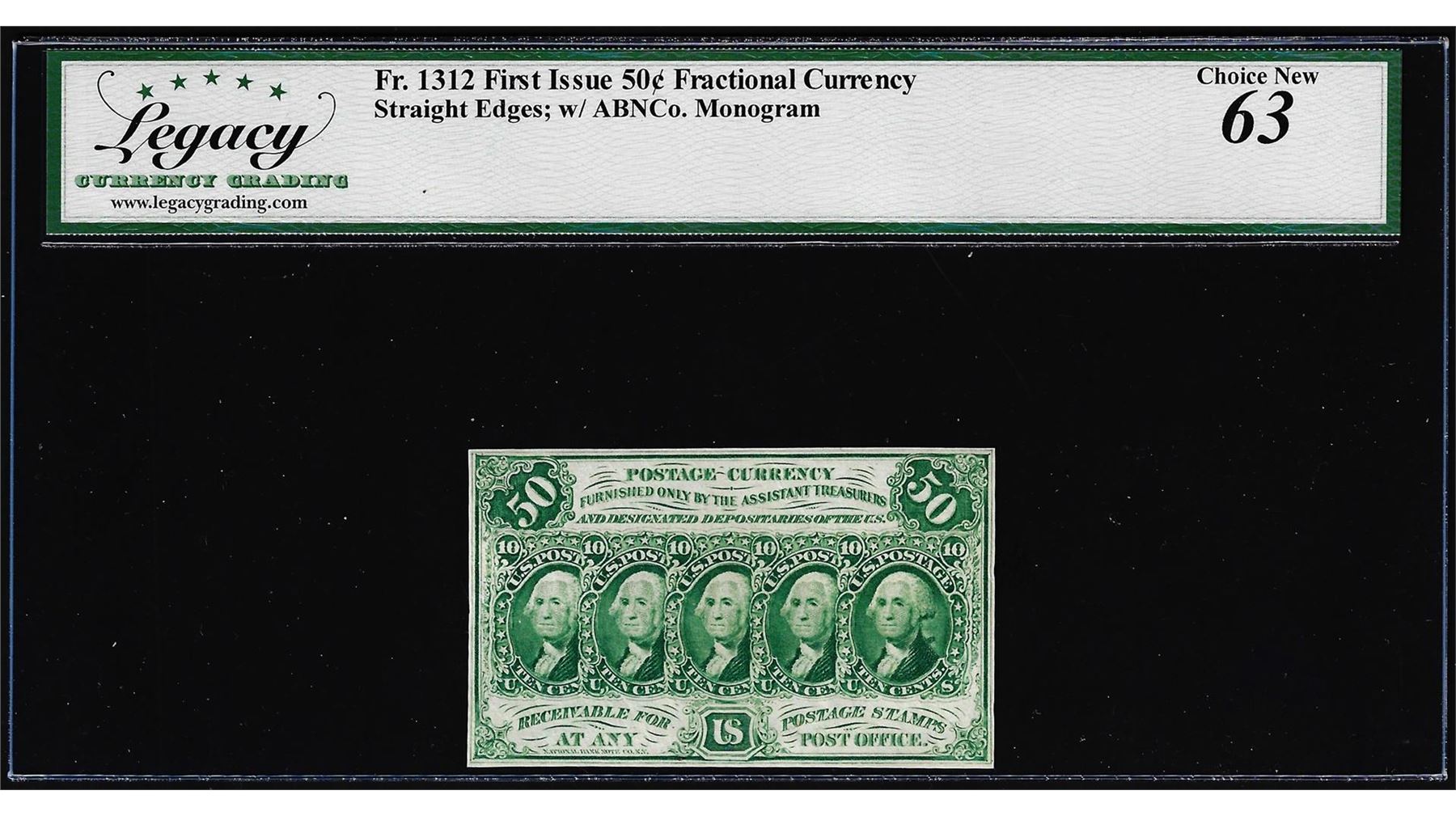 One 1862 First Issue Fifty Cents Fractional Currency Note Fr.1312 Legacy Choice New 63. Legacy Graded.