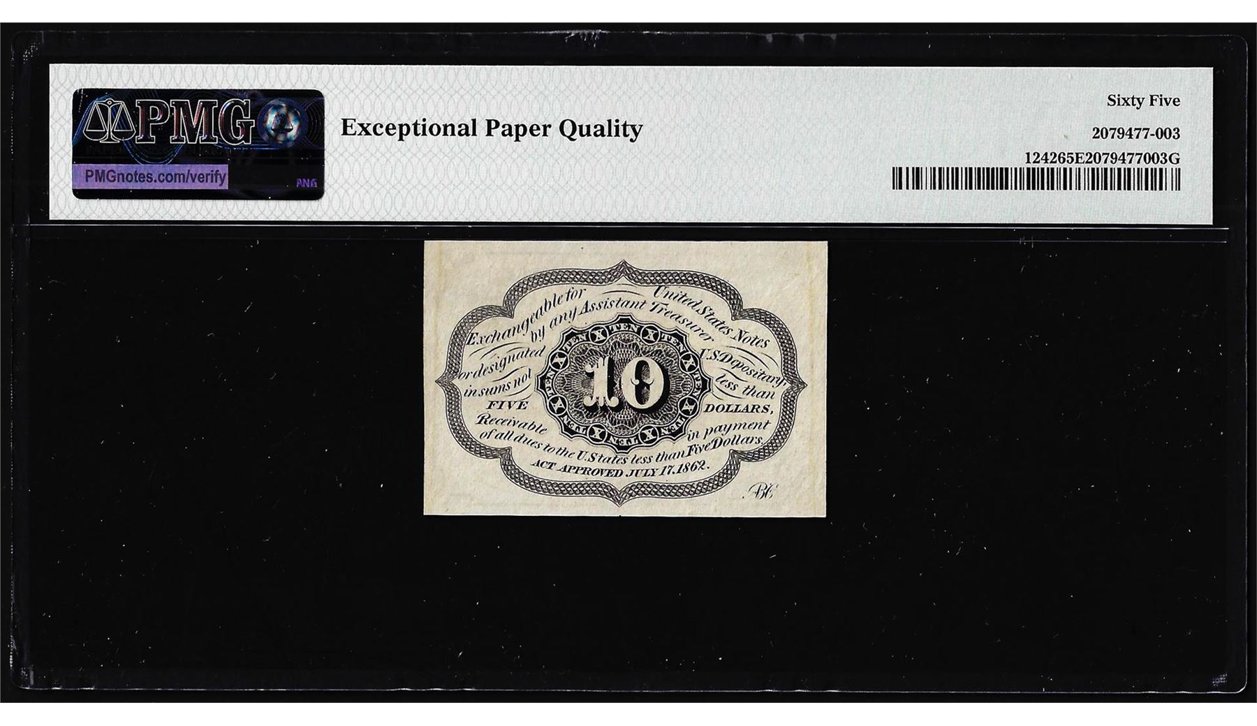 One 1862 First Issue Ten Cent Fractional Currency Note Fr.1242 PMG Gem Uncirculated 65EPQ. PMG Certified.