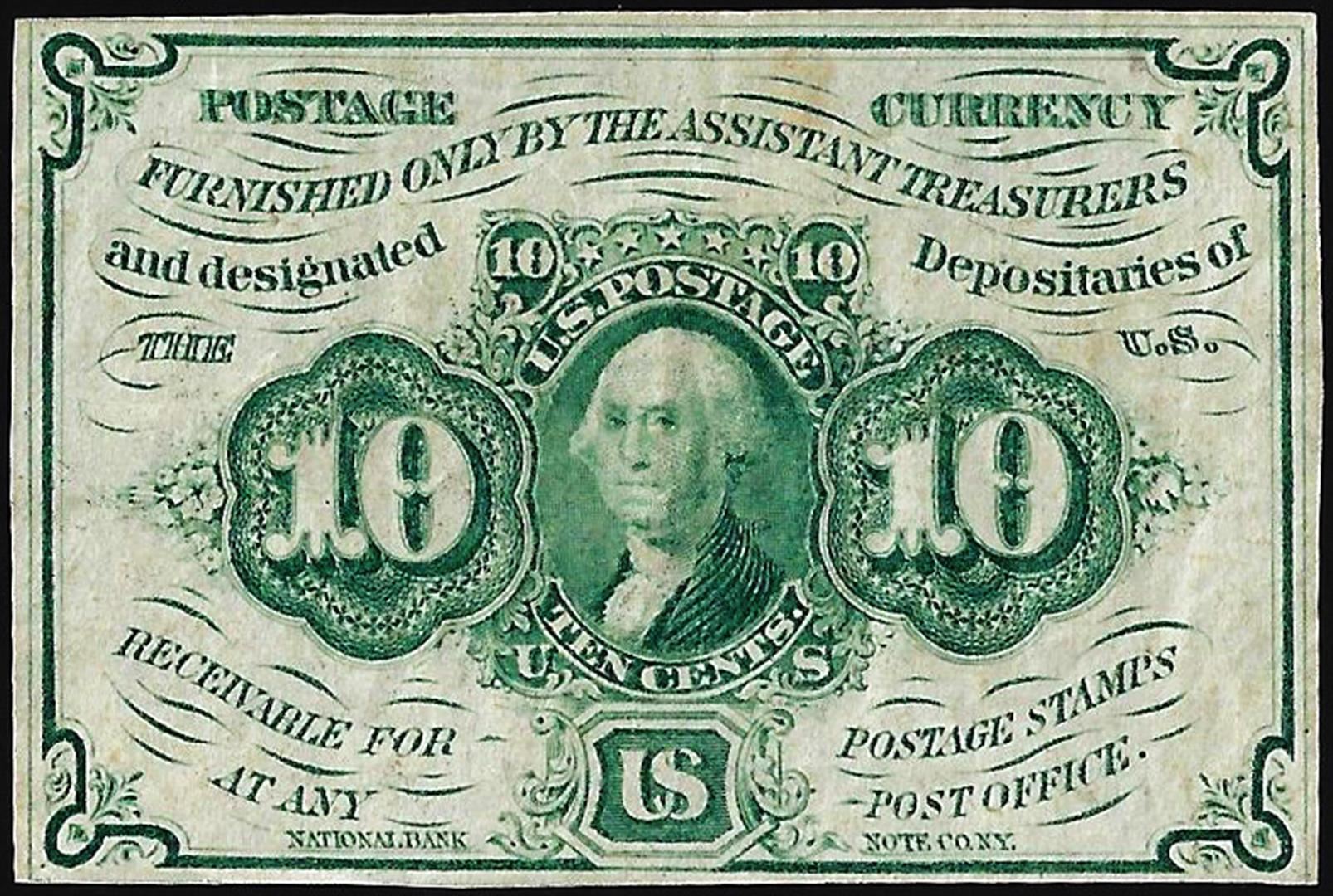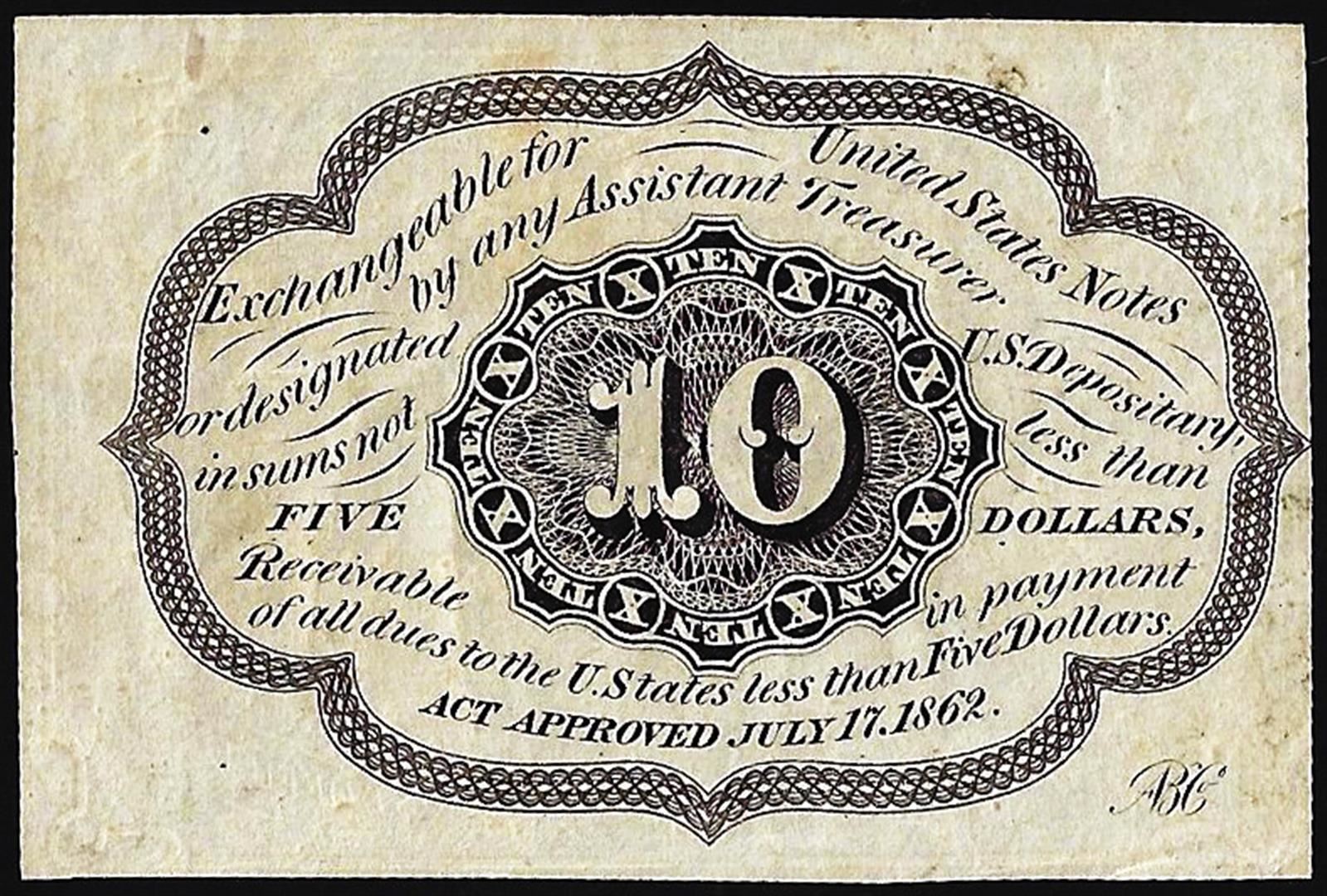 One 1862 First Issue Ten Cents Fractional Currency Note.
