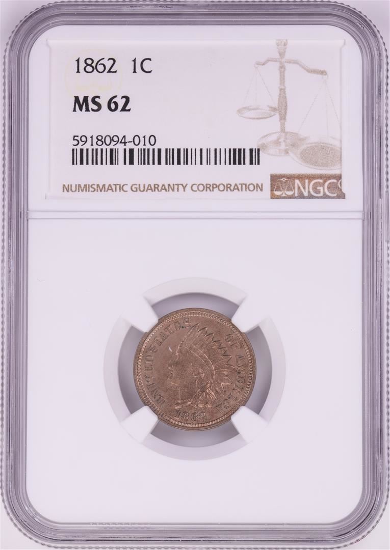 One 1862 Indian Head Cent Coin NGC MS62. NGC Certified.