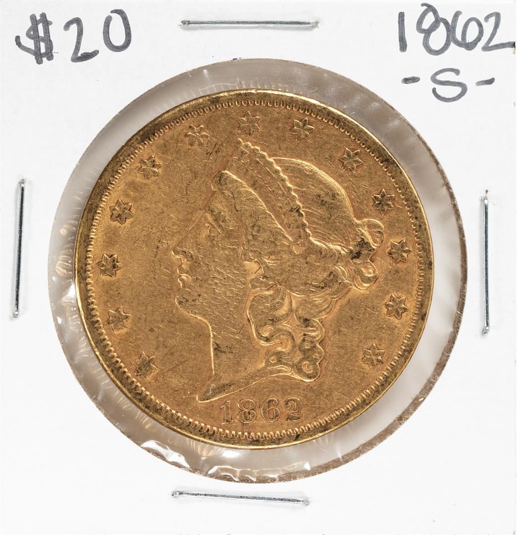 One 1862-S $20 Liberty Head Double Eagle Gold Coin.