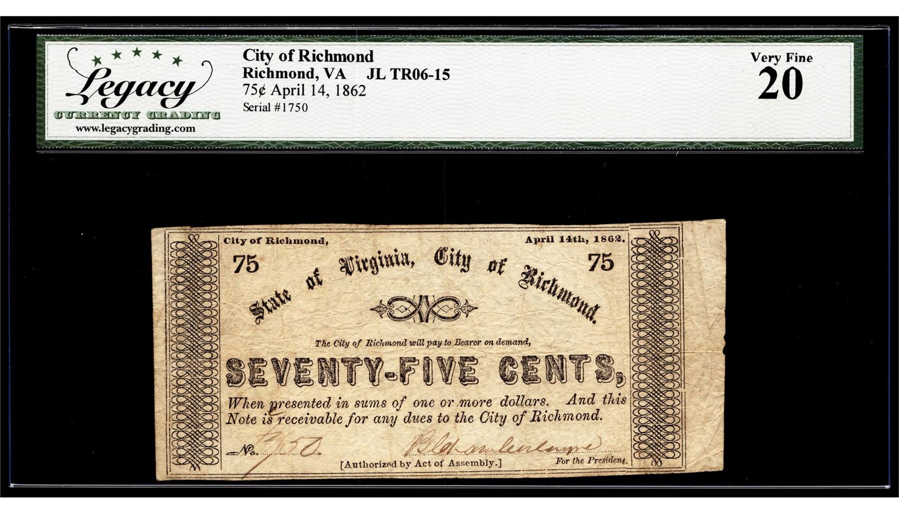 One 1862 Seventy-Five Cents City of Richmond, VA Obsolete Note Legacy Very Fine 20. Legacy Graded.