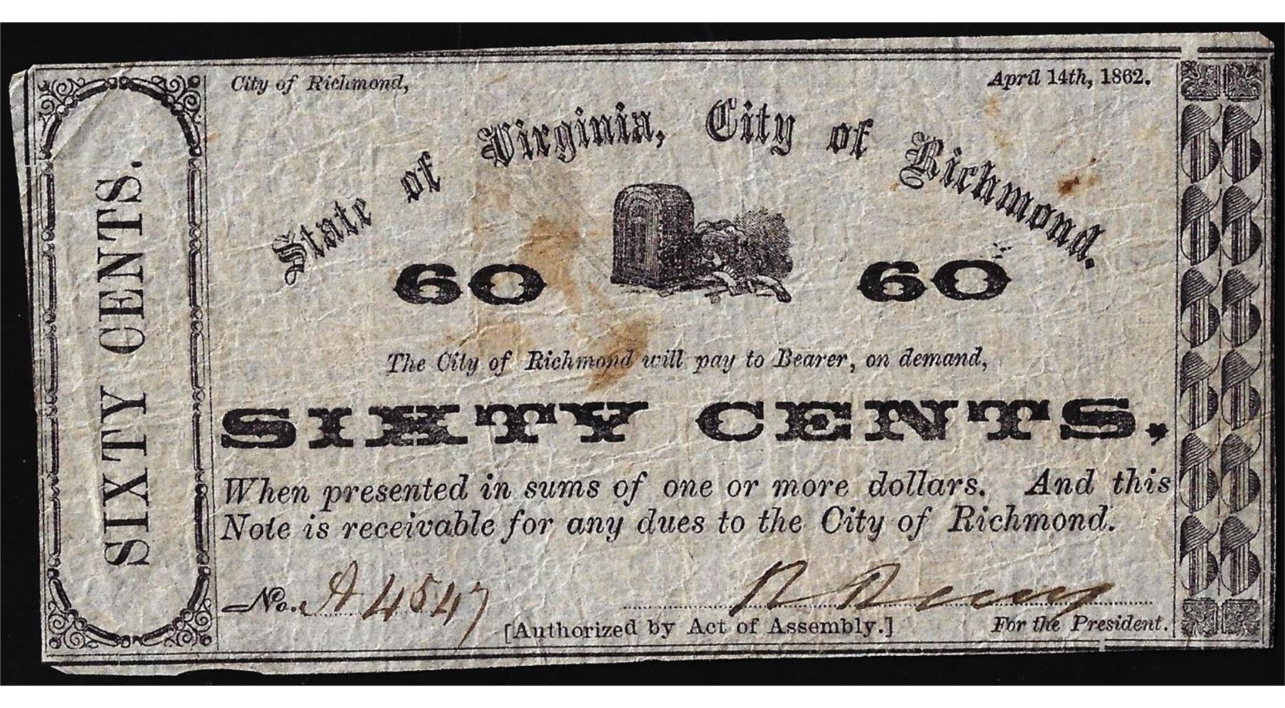 One 1862 Sixty Cents The City of Richmond, VA Obsolete Note.