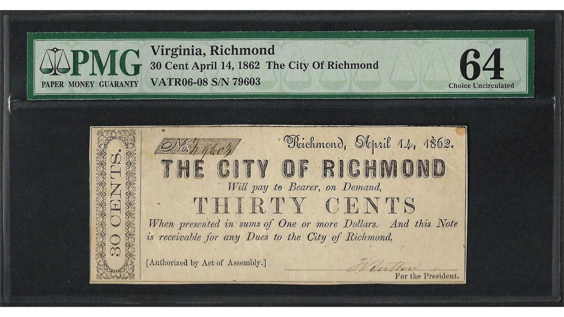 One 1862 Thirty Cents The City of Richmond Obsolete Note PMG Choice Uncirculated 64. PMG Certified.