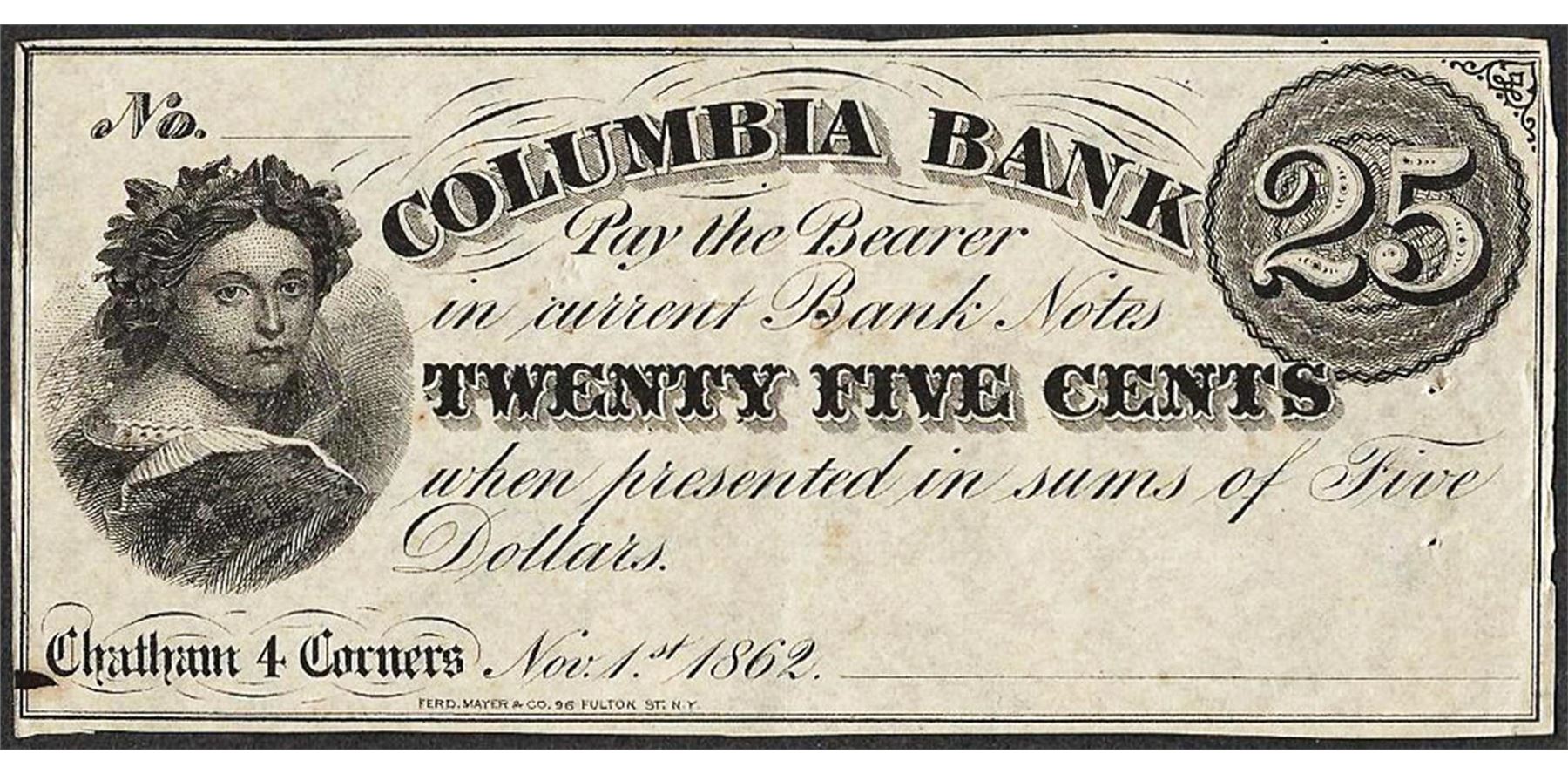 1862 Twenty Five Cents Chatham 4 Corners Columbia, NY Obsolete Bank Note