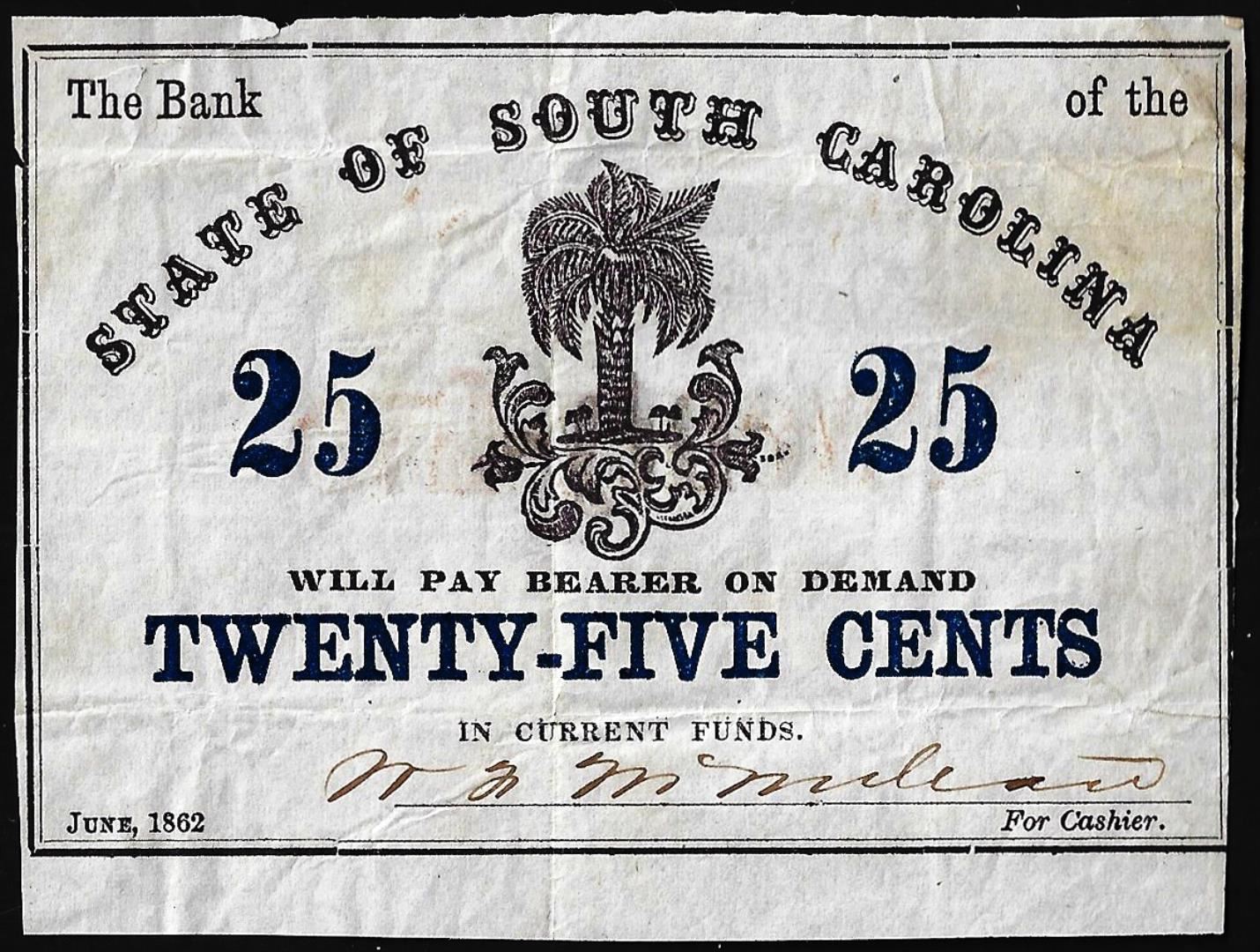 One 1862 Twenty-Five Cents The Bank of the State of South Carolina Obsolete Note.
