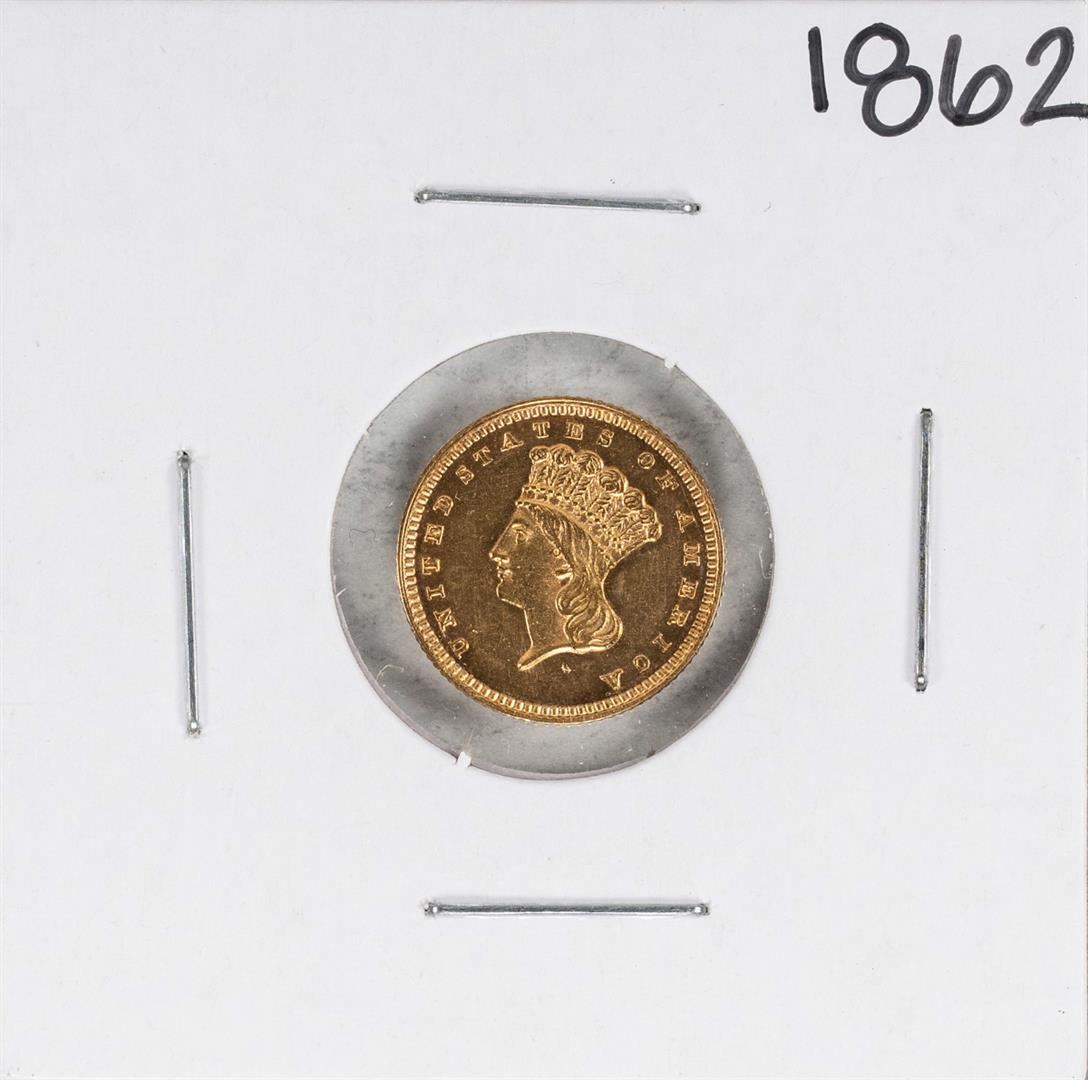 One 1862 Type 3 $1 Indian Head Gold Dollar Coin.