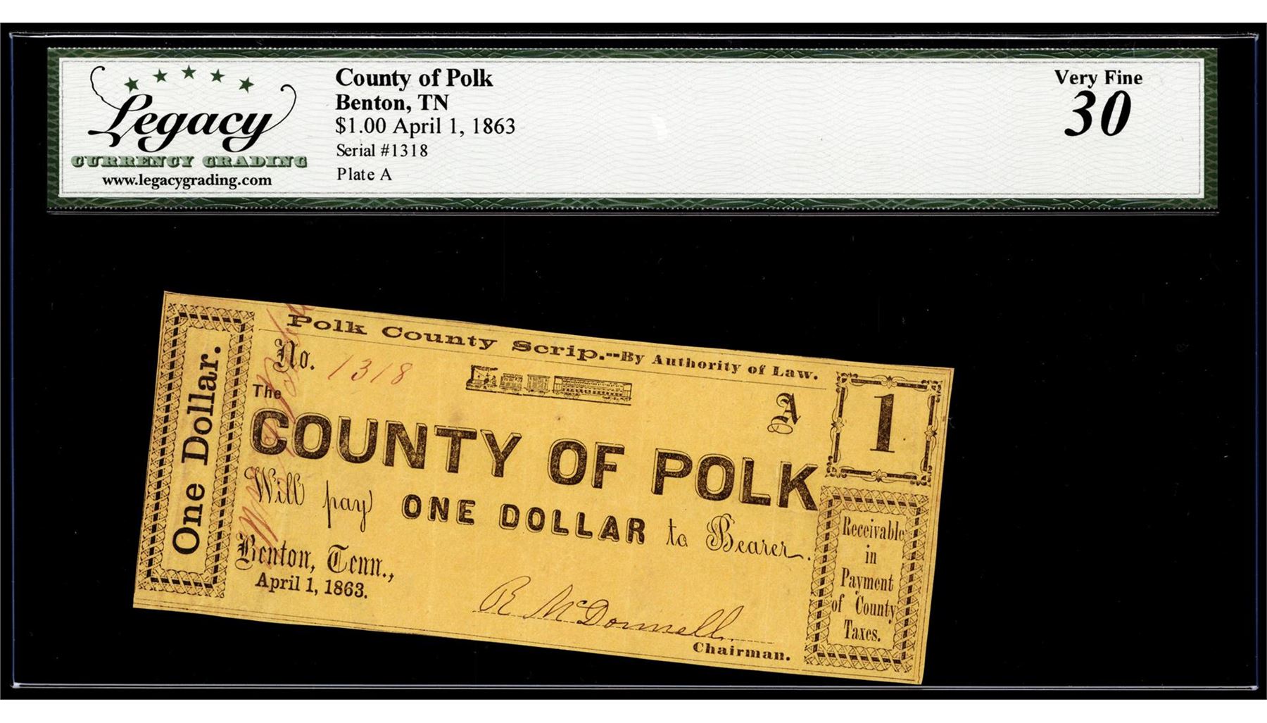 One 1863 $1 County of Polk Benton, TN Obsolete Scrip Note Legacy Very Fine 30. Legacy Graded.