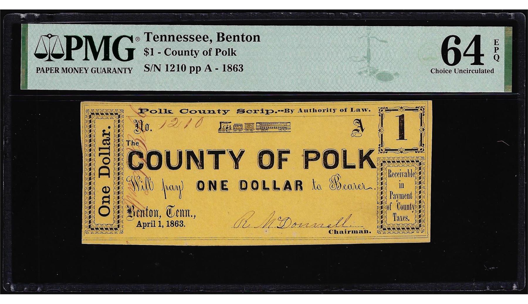One 1863 $1 County of Polk Benton, TN Obsolete Scrip Note PMG Choice Uncirculated 64EPQ. PMG Certified.
