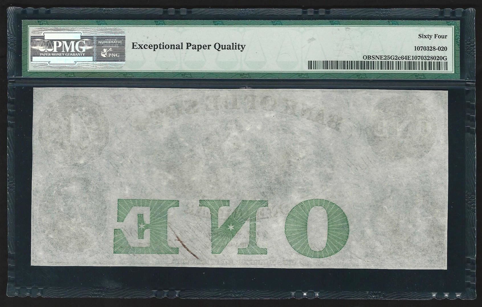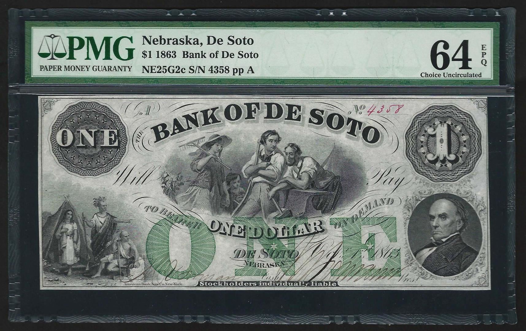One 1863 $1 Nebraska Bank of De Soto Obsolete Bank Note PMG Choice Uncirculated 64EPQ. PMG Certified.