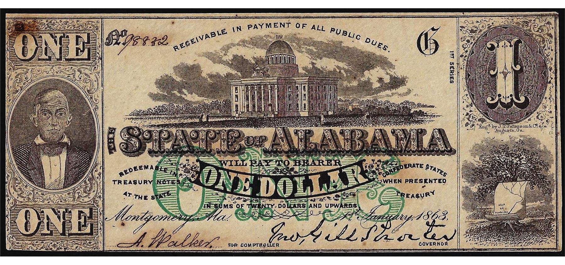 One 1863 $1 State of Alabama Montgomery, AL Obsolete Note.